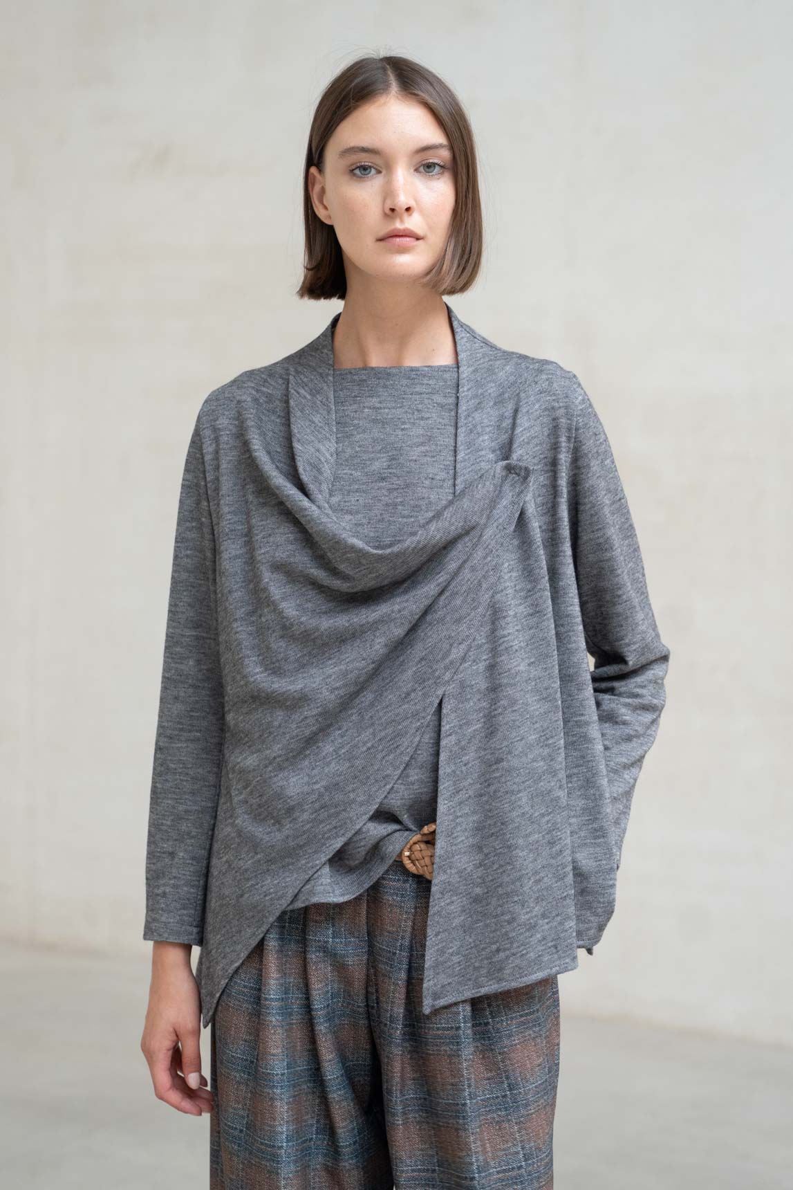 El cárdigan Liria gris es una prenda versátil que combina comodidad y estilo. Su diseño con cuello drapeado y caída fluida crea un efecto elegante y favorecedor, perfecto para superponer sobre camisetas, blusas o vestidos. El punto ligero en gris jaspeado lo convierte en un básico fácil de combinar durante todo el año, ideal tanto para looks informales como para un estilo más sofisticado.
