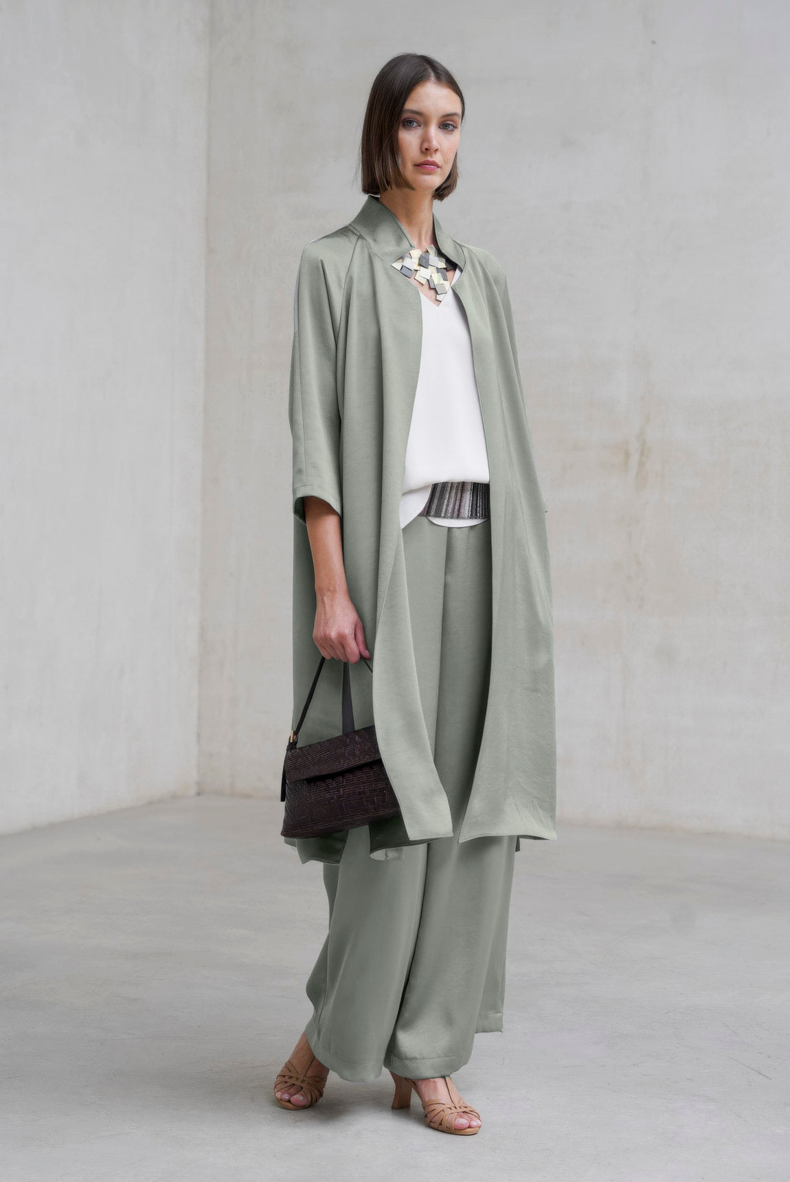 El pantalón palazzo Brisa de Rivera combina elegancia relajada y diseño atemporal. Su tonalidad verde aporta frescura y sutileza, mientras que la silueta amplia estiliza la figura con una caída fluida y favorecedora. El cierre con cremallera invisible realza su línea limpia, y los bolsillos laterales añaden funcionalidad sin romper la armonía del diseño. Una prenda versátil, ideal tanto para estilismos diarios como para ocasiones especiales.