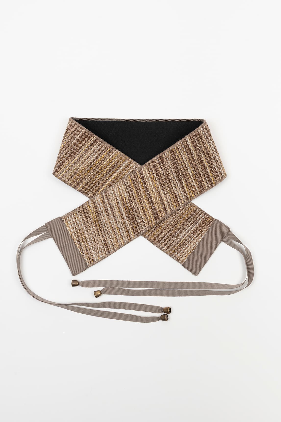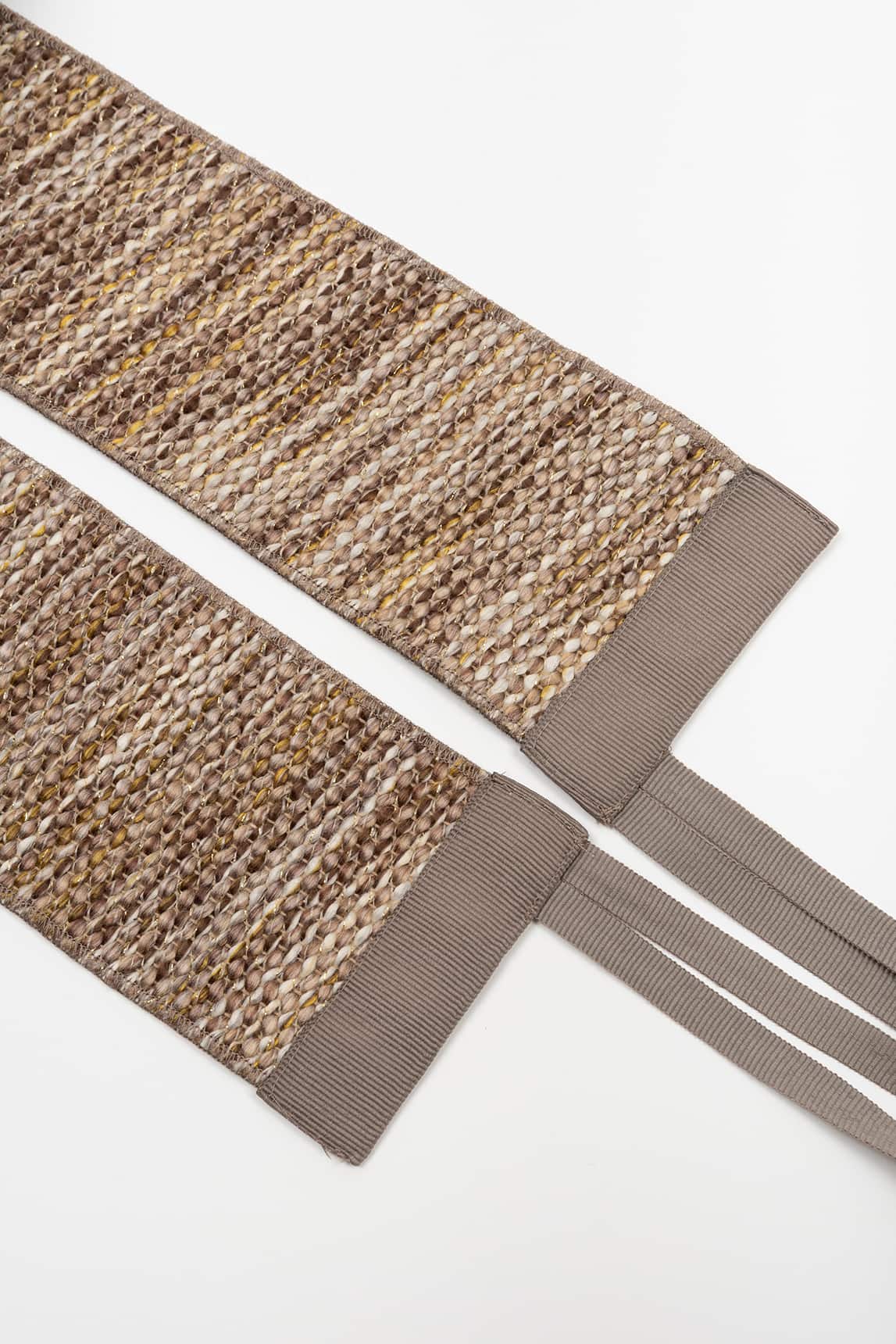 Este fajín es el equilibrio perfecto entre estilo natural y diseño sofisticado. Confeccionado en rafia trenzada en tonos tierra, aporta textura y calidez a cualquier conjunto de otoño-invierno. Las cintas de grosgrain en beige, rematadas con detalles metálicos, permiten un ajuste fácil y seguro, adaptándose a tu silueta. Su forro interior en negro añade confort sin restar elegancia. Un complemento ideal para realzar abrigos, vestidos o jerséis, aportando un toque artesanal y con carácter a tus looks de temporada.