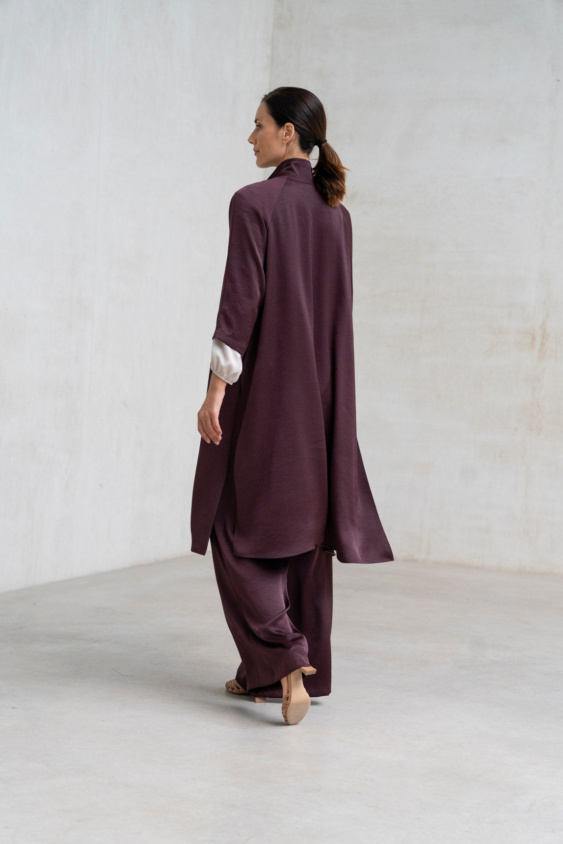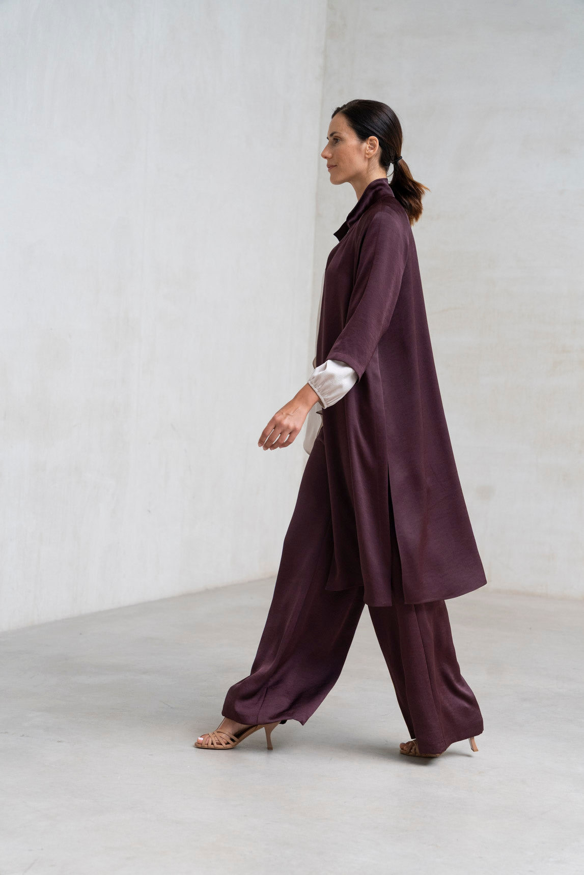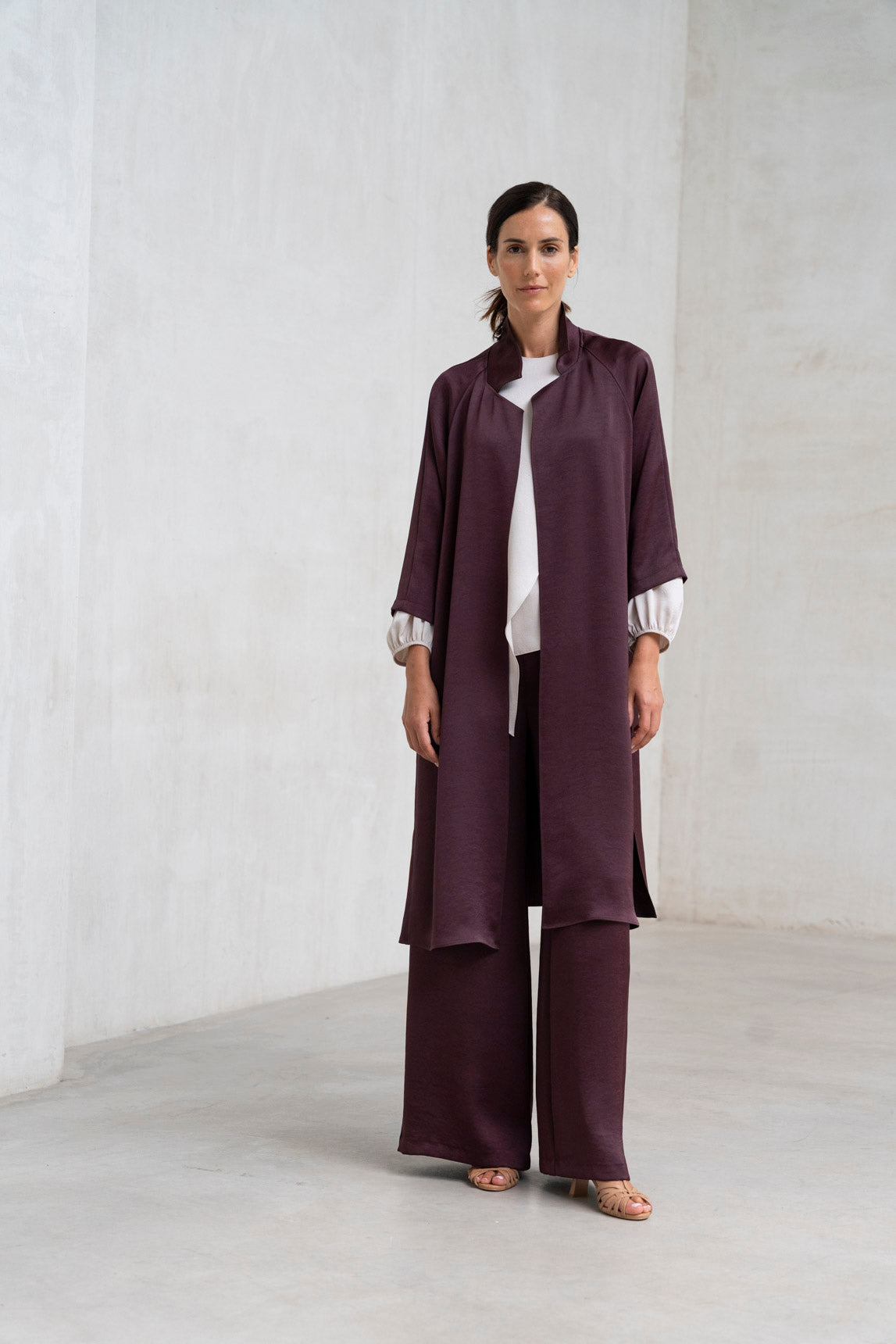 La levita Hiedra en color burdeos combina estructura y ligereza en una prenda que eleva cualquier look con elegancia serena. Su tejido fluido y su silueta amplia envuelven el cuerpo con delicadeza, mientras que el cuello camisero y las aberturas laterales aportan equilibrio entre forma y funcionalidad. Ideal para jugar con capas y texturas, esta levita es una aliada versátil y atemporal.