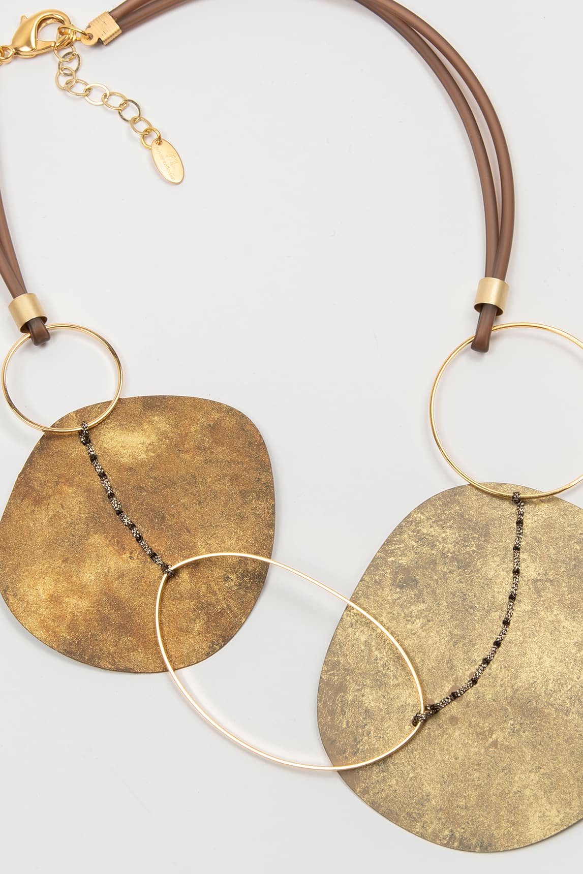 Este collar corto combina formas orgánicas y geométricas con gran equilibrio visual. Dos piezas irregulares de latón envejecido se entrelazan con aros dorados ligeros, unidos por una cadena negra que aporta textura y contraste. El diseño se completa con dos tubos marrón satinado que rodean el cuello con firmeza y elegancia.