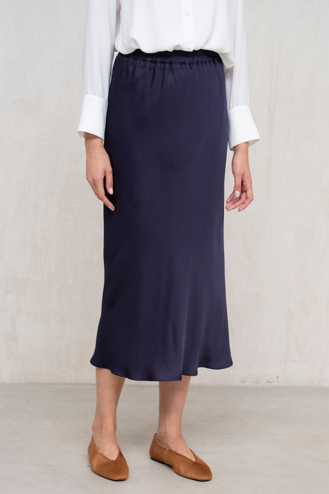 - Falda midi de cintura elástica y corte recto ligeramente evasé.