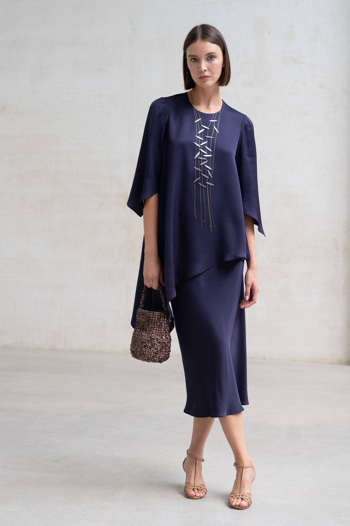 - Tejido satinado de tacto suave y caída fluida, que aporta un movimiento elegante a cada paso.