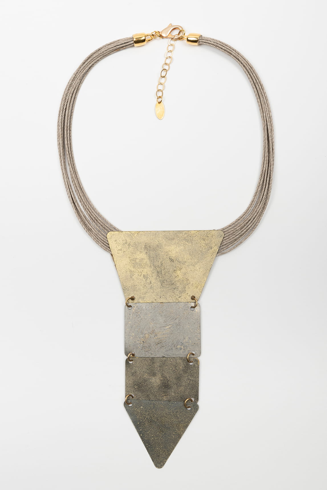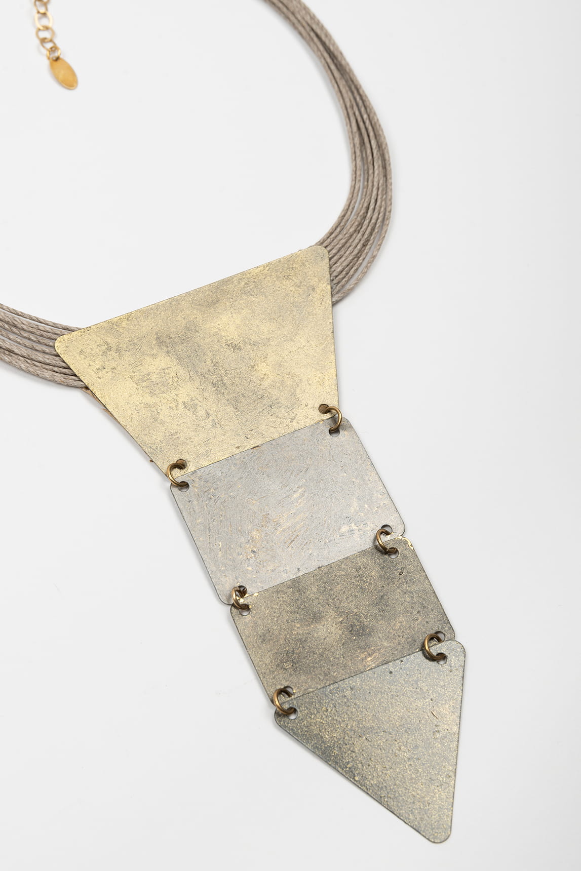 Este collar está compuesto por múltiples hilos de cuerda en tono neutro, que aportan un contraste armonioso con las placas metálicas superpuestas en tonos dorado y plateado envejecido. Su cierre ajustable con broche de langosta permite adaptarlo perfectamente a tu cuello, brindando comodidad y estilo en cada uso.