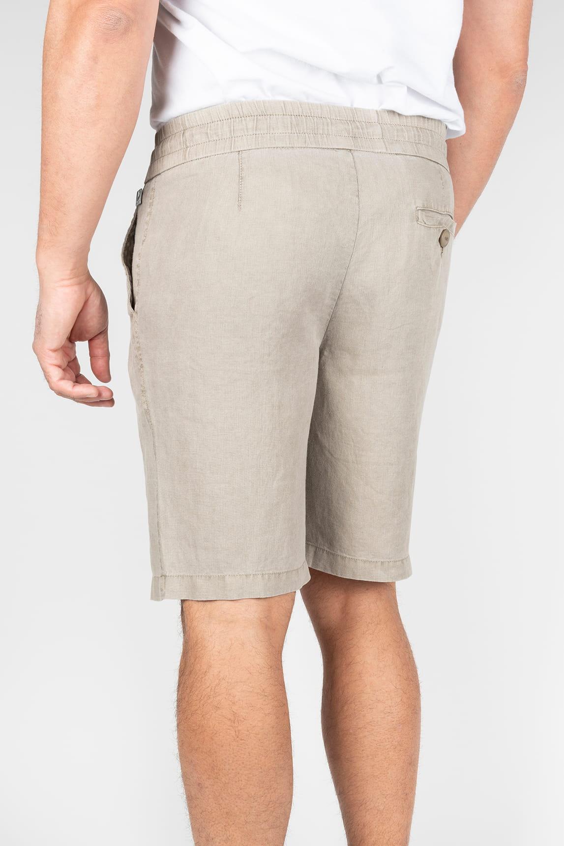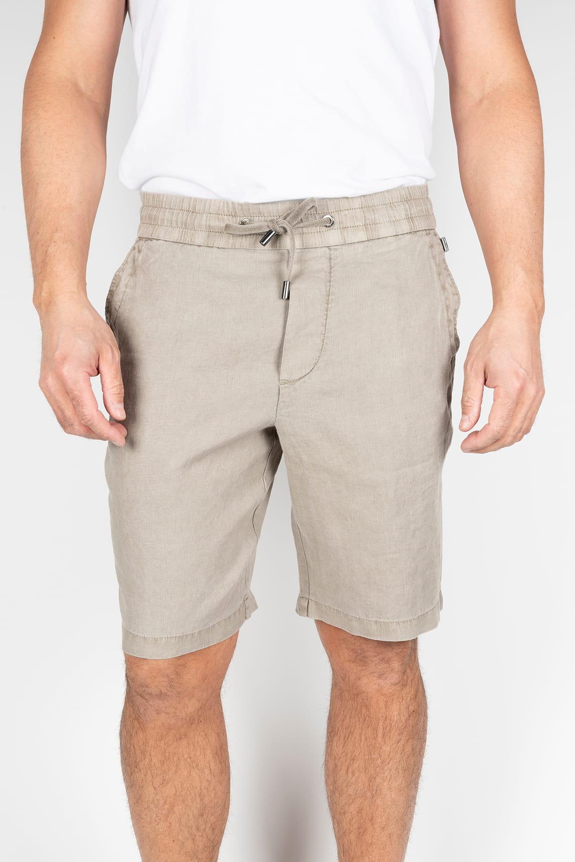 Esta bermuda en tono piedra presenta una estética limpia y luminosa, con largo por encima de la rodilla y una silueta recta que aporta equilibrio y comodidad. La cintura elástica con cordón ajustable se muestra de forma visible, reforzando su carácter funcional, mientras los bolsillos laterales y el frente depurado mantienen una imagen ordenada. El tejido de apariencia ligera y textura suavemente natural sugiere frescura, con una caída fluida que acompaña el movimiento con naturalidad.