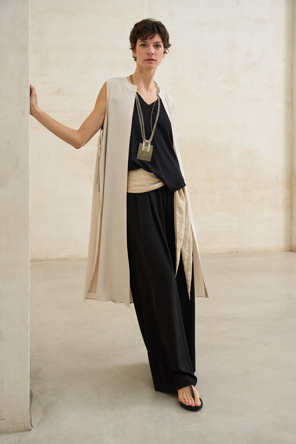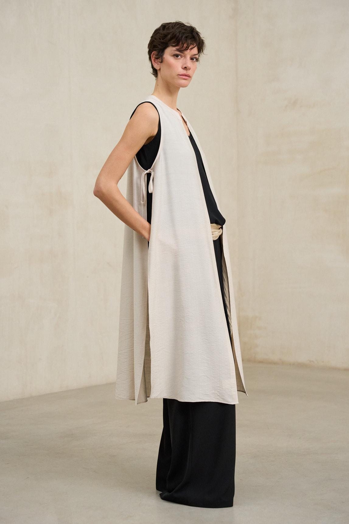 El chaleco Mireth crudo es una prenda ligera y estructurada que aporta sofisticación relajada a cualquier conjunto. Confeccionado en tejido fluido de caída suave, presenta un diseño sin mangas y silueta abierta que estiliza visualmente la figura y permite jugar con las superposiciones.