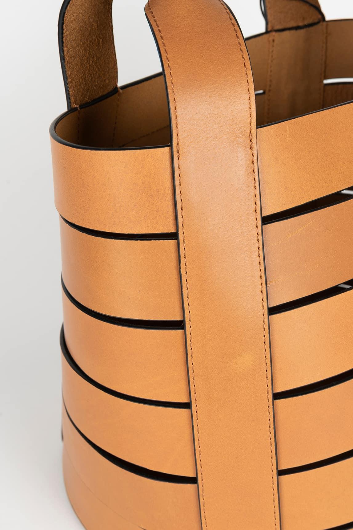 Bolso de piel en tono cuero, un color cálido y luminoso que realza el acabado natural del cuero y aporta personalidad a cualquier estilismo. Su diseño tipo bucket estructurado con bandas horizontales crea un efecto arquitectónico moderno y muy reconocible.