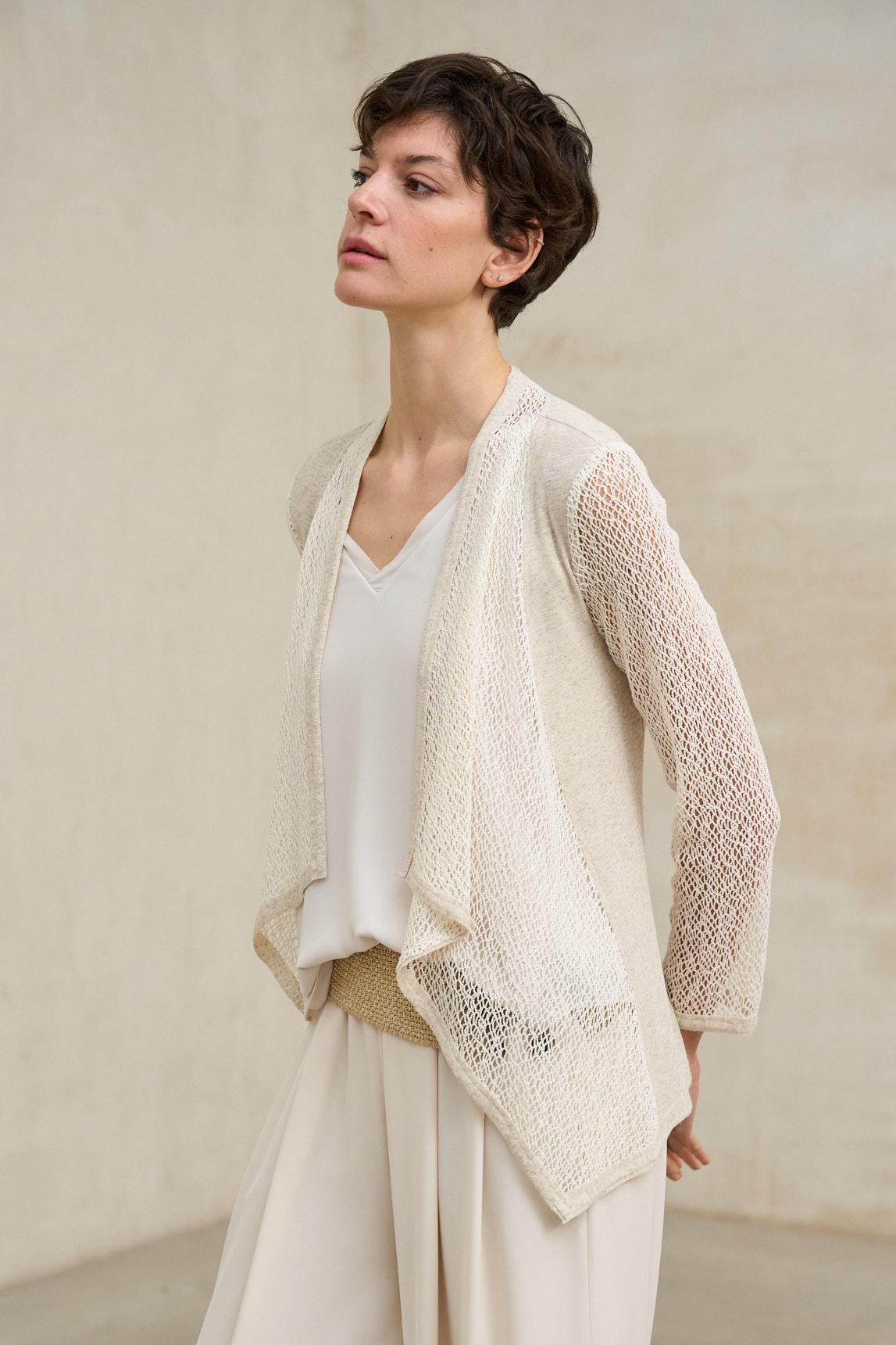Chaqueta de mujer confeccionada en combinación de tejidos que aportan textura y ligereza a la prenda. El cuerpo en tejido liso y fluido con caída suave se integra con mangas y paneles en delicado tejido calado, creando un sutil contraste visual y un efecto ligeramente semitransparente. Su diseño abierto, sin cierre visible, presenta un frontal de líneas asimétricas que aporta movimiento y dinamismo al conjunto. La manga larga y el corte relajado refuerzan su estética minimalista y versátil.