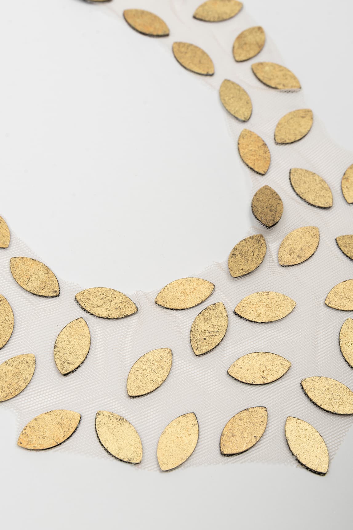 Collar tipo babero confeccionado sobre base de tul semitransparente en tono marfil, ligero y flexible. Está decorado con múltiples apliques metálicos en forma de hoja (almendrada) en acabado dorado texturizado, distribuidos por toda la pieza para crear un efecto de mosaico. Cierre superior con cadena extensible y mosquetón para ajustar al cuello.