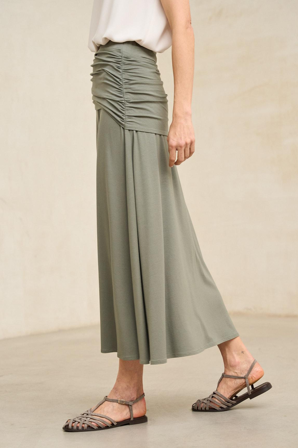 Falda de mujer confeccionada en tejido de punto fluido con una caída elegante y suave. Diseño largo con efecto drapeado en la parte superior que aporta movimiento y realza la silueta de forma natural. Cintura alta con banda ancha que proporciona sujeción y comodidad, favoreciendo un ajuste perfecto sin perder ligereza.