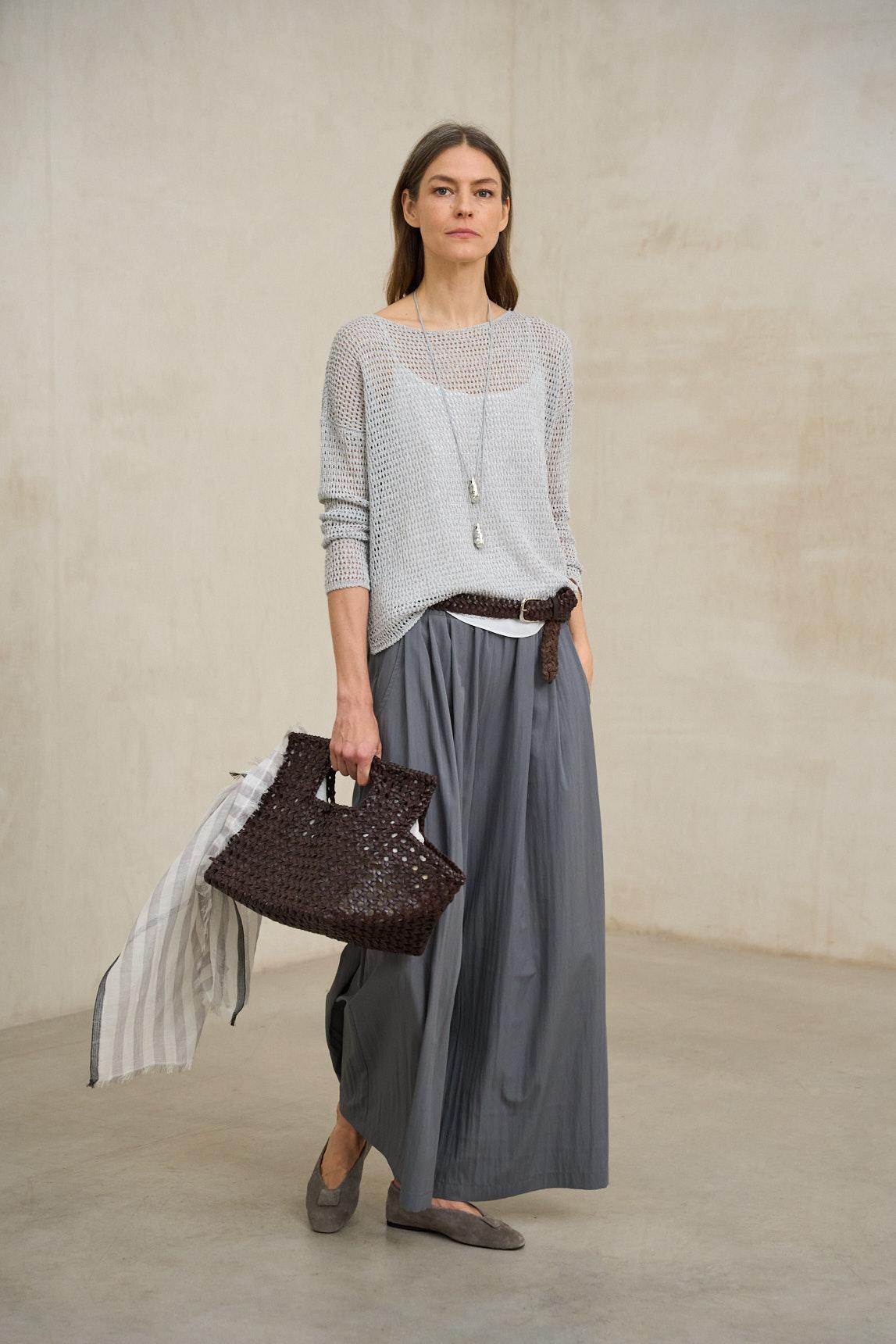 El jersey Lúvena gris azulado destaca por su ligereza y su delicada textura calada en la parte superior, que aporta un detalle sutil sin perder minimalismo. Su punto fino es ligeramente translúcido, por lo que se recomienda combinarlo con una camiseta interior o top básico (no incluido).