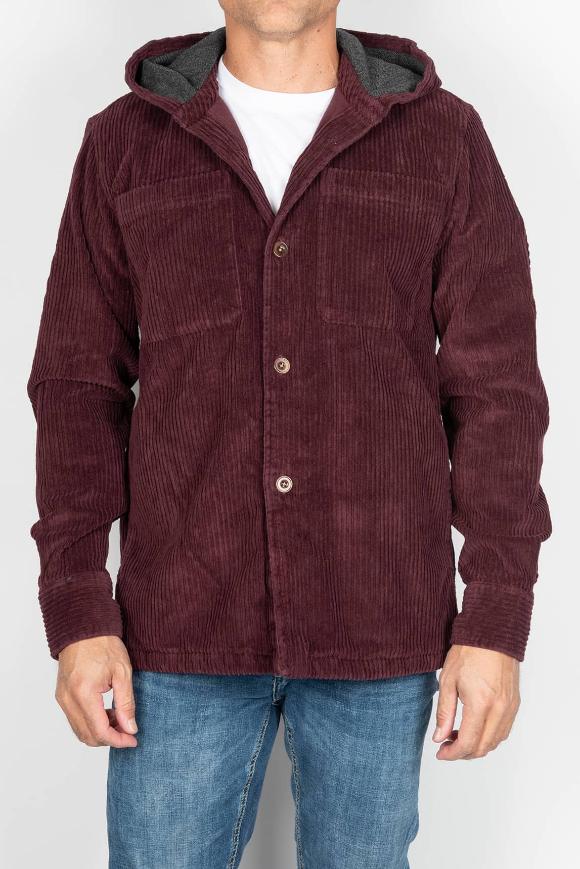 - Sobrecamisa burdeos en pana de canalé ancho.