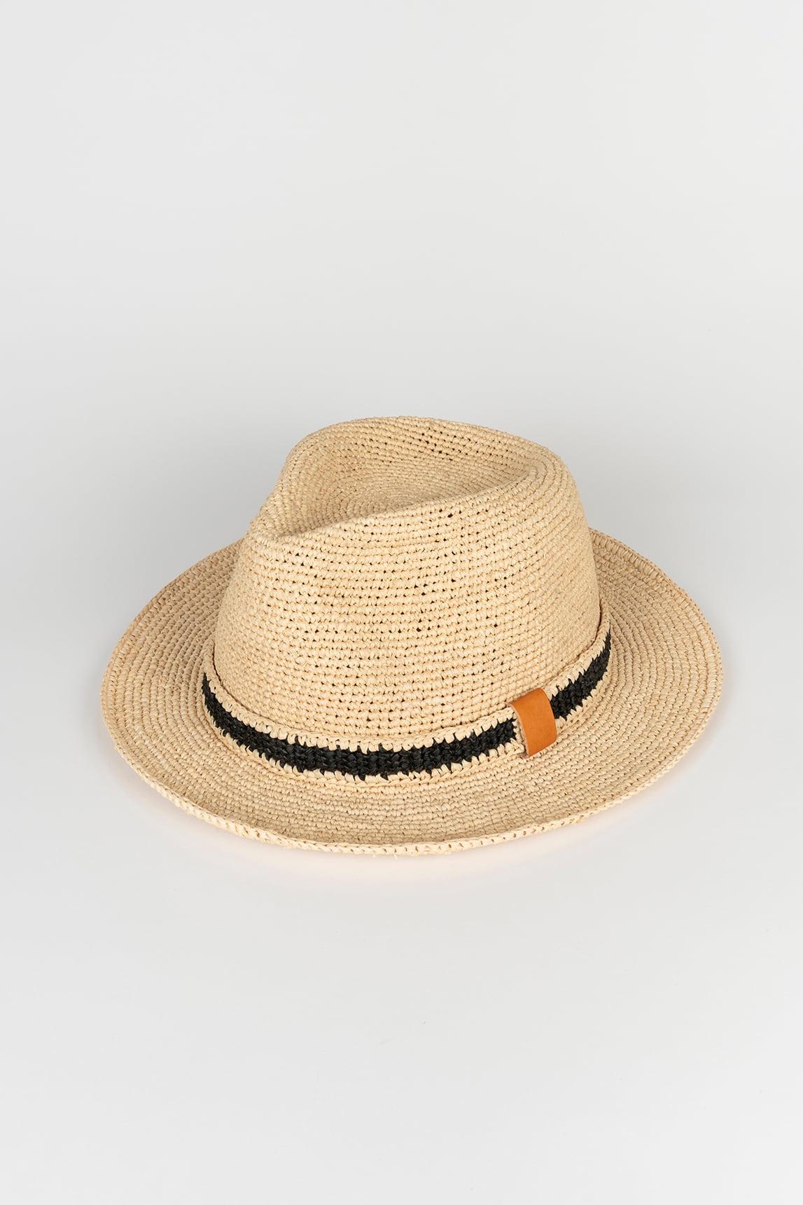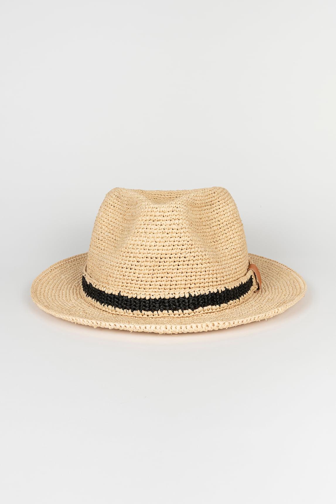 Sombrero de mujer en color natural con copa de inspiración fedora, ala media y superficie calada de aspecto artesanal. El diseño presenta una estructura ligera de trenzado abierto que aporta frescura visual y una imagen muy veraniega, mientras la cinta negra en contraste introduce un detalle más marcado y contemporáneo. La combinación de tonos refuerza su presencia sin perder naturalidad.