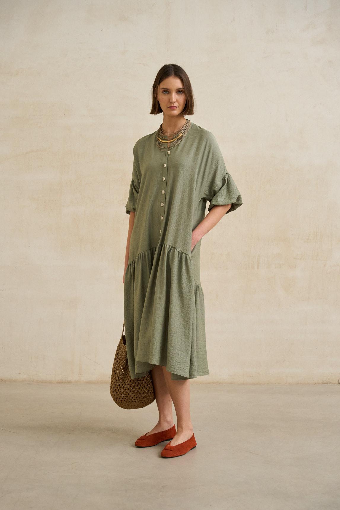 El Vestido Arisse verde salvia combina estructura suave y elegancia relajada en una silueta femenina y fluida. Confeccionado en tejido ligero de tacto natural, presenta cuello camisero, botonadura frontal completa y manga corta ligeramente estructurada. El diseño incorpora un corte en la cintura con fruncido integrado que aporta forma y movimiento sin necesidad de cinturón. Este detalle define suavemente la silueta y genera una caída amplia y natural en la falda, creando un efecto ligero y favorecedor al caminar. El largo midi y la fluidez del tejido refuerzan su carácter versátil y contemporáneo. El tono verde salvia aporta serenidad y combina con naturalidad con accesorios en cuero, rafia o tonos arena. Puede llevarse con sandalias planas para un look de día cuidado o elevarse con cuñas o tacón medio para comidas, eventos o reuniones especiales. Una pieza femenina y atemporal que equilibra frescura, proporción y ligereza con naturalidad. Nos esforzamos por mostrar los colores de la forma más fiel posible, pero pueden variar ligeramente respecto a la realidad.