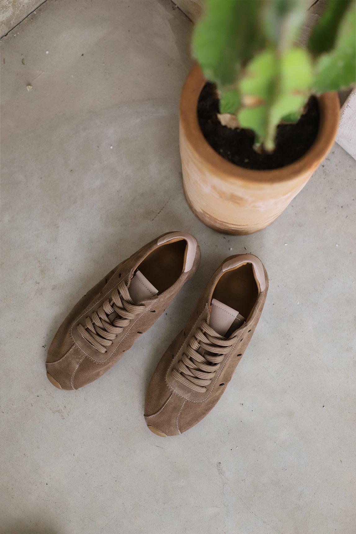 Confeccionada en piel serraje suave, incorpora pequeñas perforaciones laterales que favorecen la transpirabilidad y añaden un detalle visual sutil. Los cordones en el mismo tono refuerzan su carácter equilibrado, mientras que la suela flexible garantiza comodidad y estabilidad en cada paso.