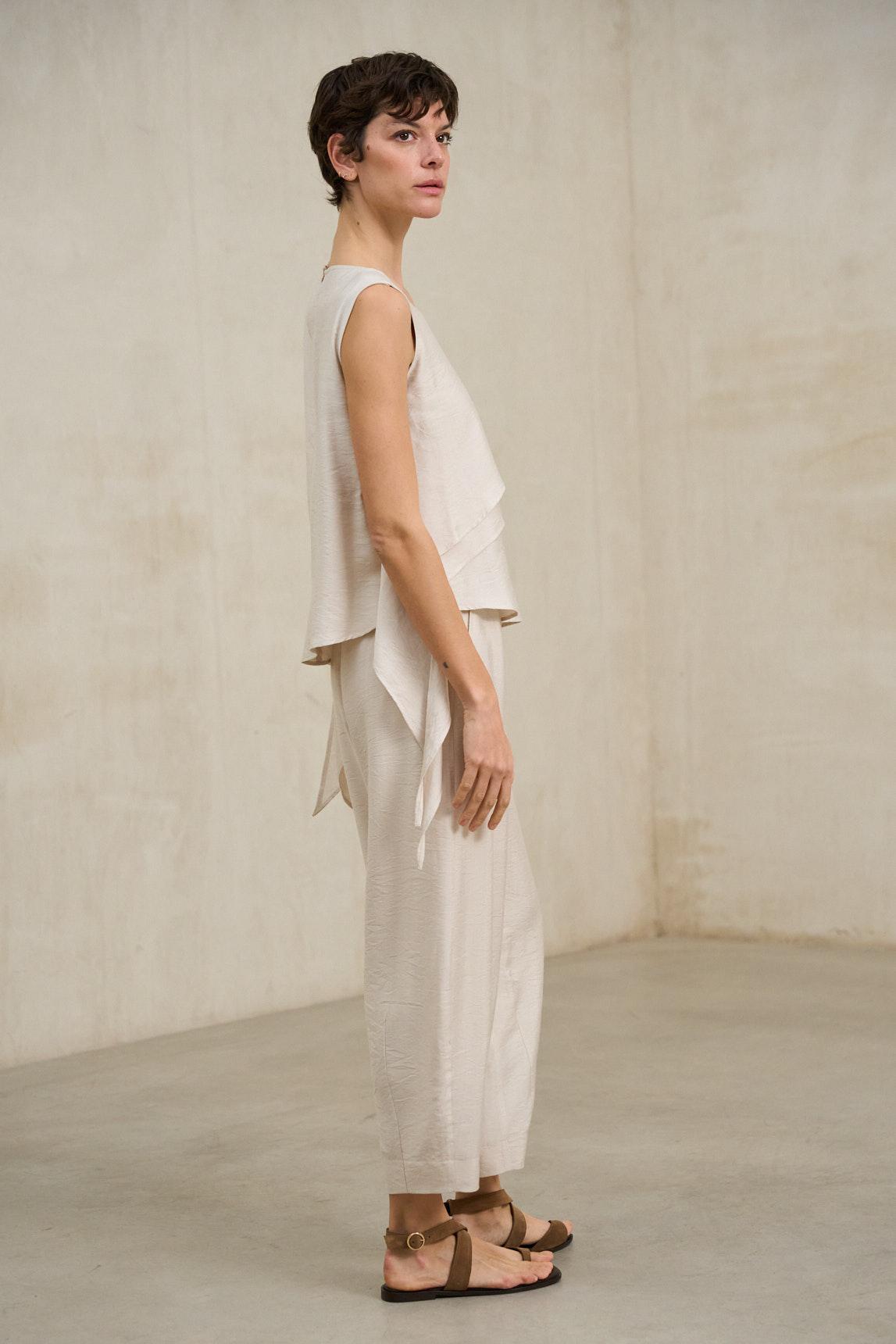 Esta blusa de escote redondeado y hombros al aire presenta una textura delicadamente arrugada que le da profundidad al crudo roto. El detalle protagonista es el volante frontal en capas, que aporta volumen suave y un movimiento ligero sobre el delantero. La silueta se percibe amplia y fluida, con bajo asimétrico e irregular que estiliza y deja el look más etéreo, además de una abertura trasera con cierre discreto.