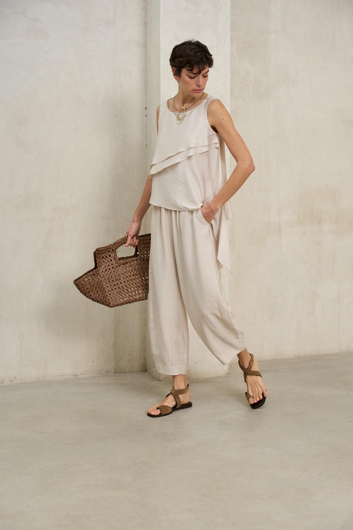 El crudo se vuelve especialmente versátil: combina con denim oscuro para un contraste moderno, con pantalón beige para un conjunto luminoso o con negro para un efecto más sofisticado. El volante aporta interés sin necesidad de accesorios, y el corte holgado permite llevarla por fuera o con un semimetido para marcar la cintura. Es una prenda pensada para cuando quieres verte arreglada sin complicarte: fresca, ligera y con un detalle que se nota a primera vista. Ideal para celebraciones de día, cenas en terraza o para elevar un look básico con un toque delicado.