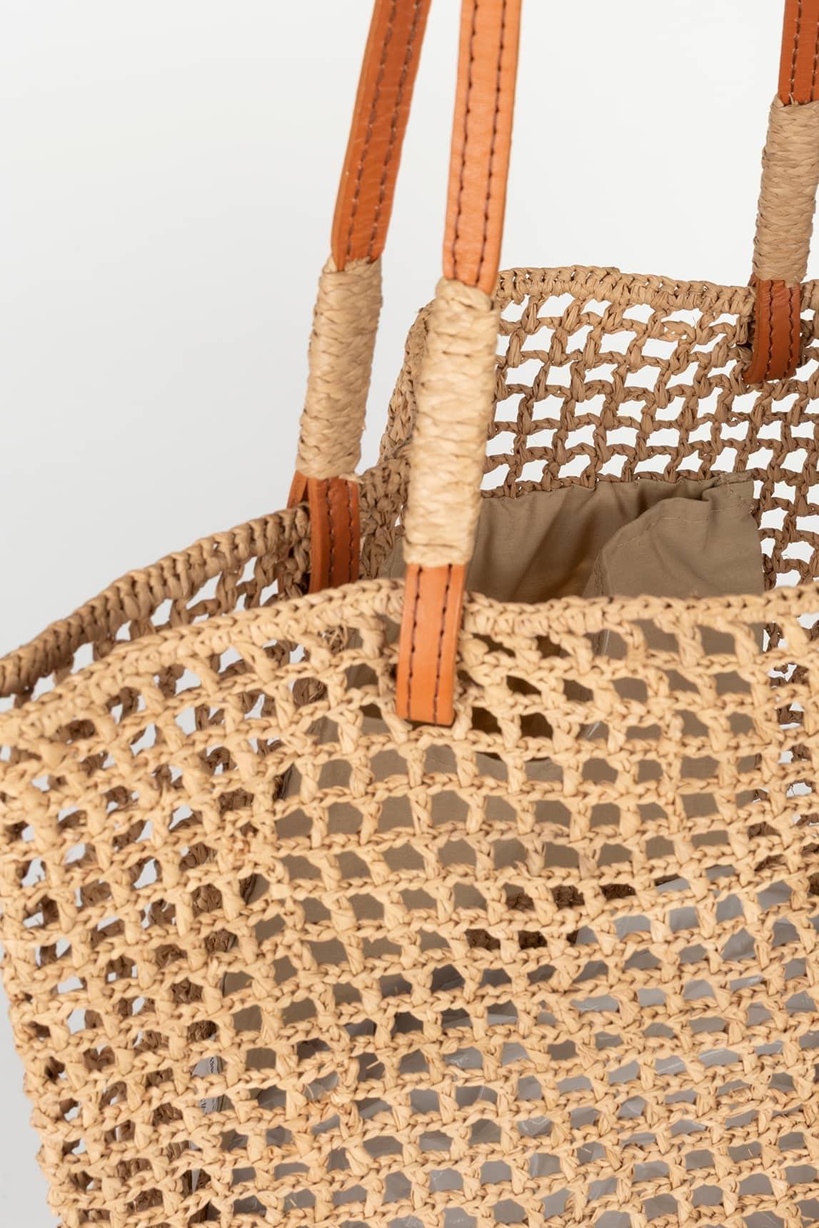 Bolso de mujer confeccionado en rafia natural con silueta amplia y base redondeada. El diseño combina un cuerpo superior de estructura calada tipo rejilla con una parte inferior más compacta de trenzado cerrado, creando un contraste de texturas que aporta ligereza visual y un acabado artesanal muy marcado. Incorpora asas largas en tono cuero que permiten llevarlo cómodamente al hombro, añadiendo un matiz cálido y natural al conjunto.