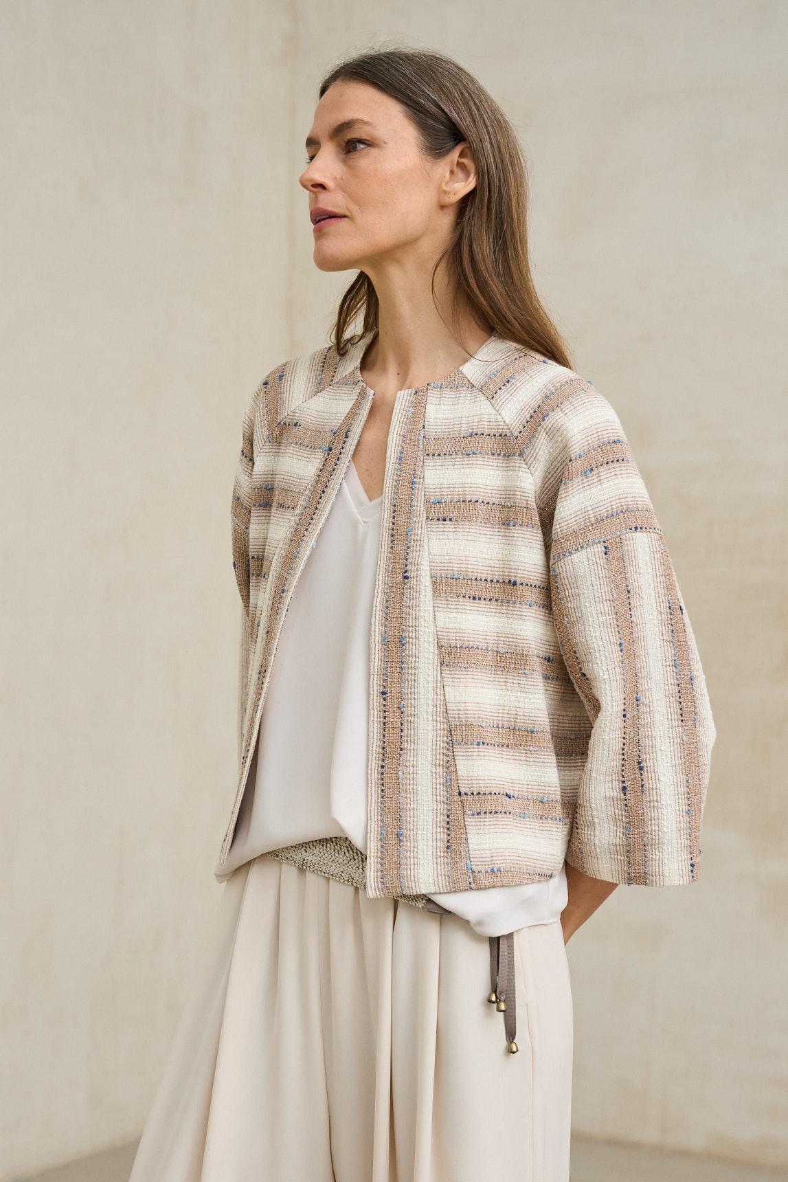 Chaqueta de mujer confeccionada en tejido de textura marcada con patrón geométrico en tonos beige y crudo, que aporta un efecto visual dinámico y artesanal. Presenta cuello redondo, cierre frontal con botones al tono y bolsillos de parche que refuerzan su carácter funcional. El corte recto y el largo a la cadera crean una silueta equilibrada, mientras que su estructura ligera permite superposición sin añadir rigidez. La Chaqueta Taiven beige combina inspiración étnica y estética contemporánea en una prenda versátil de entretiempo. Su diseño estructurado, pero fluido, permite llevarla tanto cerrada como abierta sobre camisetas básicas, blusas o prendas de punto fino. Los tonos neutros facilitan su combinación con pantalones claros, denim o gamas tierra, integrándose con naturalidad en armarios de estilo relajado y elegante. Pensada como una capa ligera con personalidad, esta chaqueta aporta textura y profundidad al look sin sobrecargar el conjunto, convirtiéndose en una pieza clave para estilismos equilibrados y actuales. Nos esforzamos por mostrar los colores de la forma más fiel posible, pero pueden variar ligeramente respecto a la realidad.