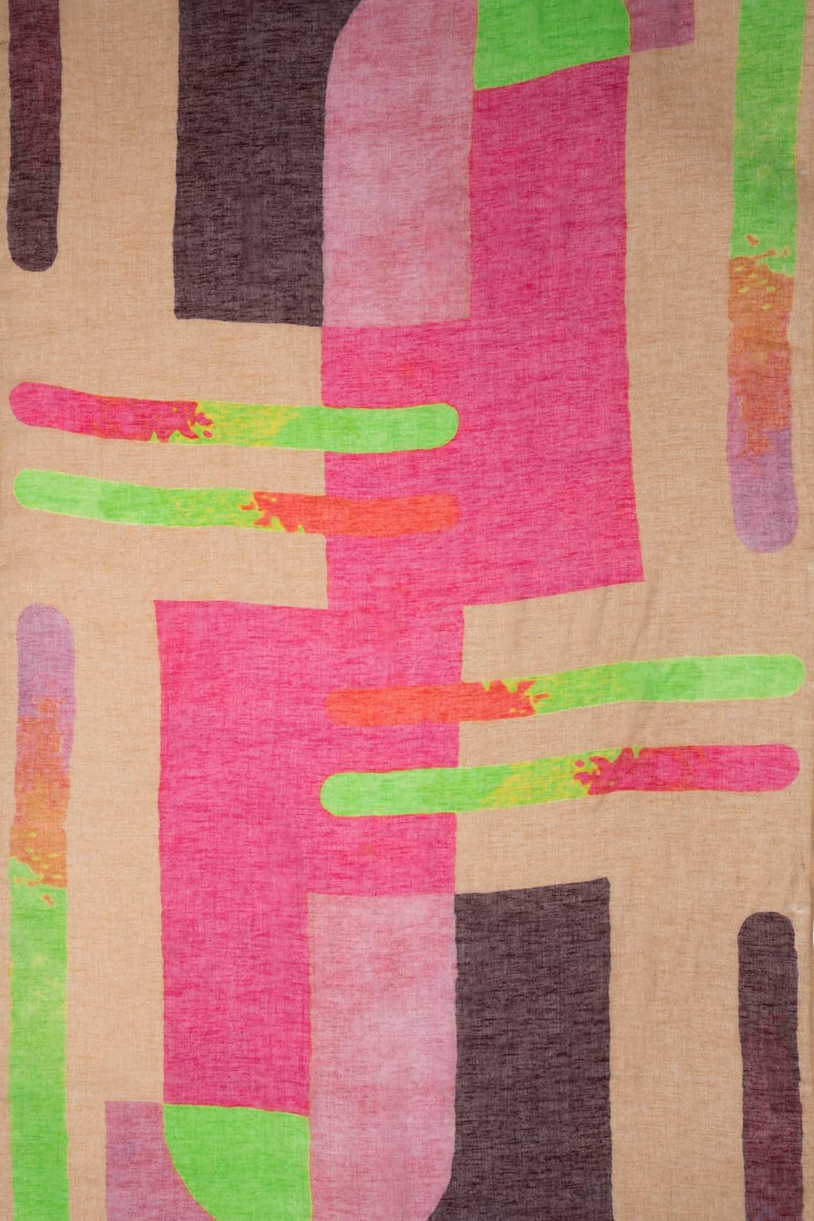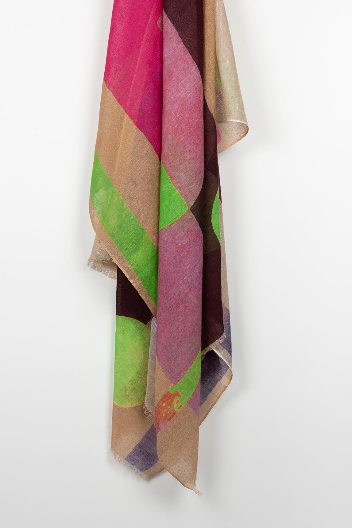 El Fular Neraya fucsia y verde destaca por su composición cromática vibrante, donde se combinan bloques de color en fucsia intenso, verde lima, tonos arena y matices profundos que generan contraste y dinamismo.