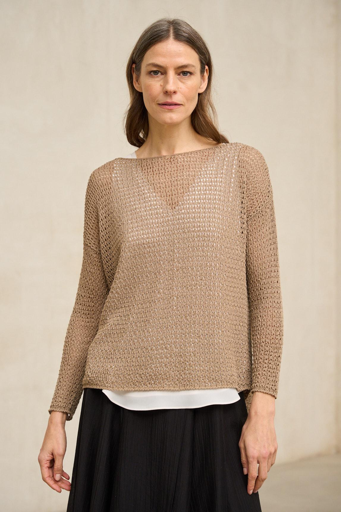 El jersey Lúvena camel suave es una prenda ligera confeccionada en punto fino con textura calada en la parte superior, que aporta un sutil juego visual y un acabado delicado. Su tejido es ligeramente translúcido, por lo que se recomienda combinarlo con una camiseta interior o top básico (no incluido). Para un acabado limpio y armónico, recomendamos el top Alenia blanco roto, diseñado como base perfecta para este tipo de prendas caladas. Presenta escote redondo amplio y manga tres cuartos, con una caída suave que favorece la silueta sin ceñir. Su estructura liviana lo convierte en una opción ideal para entretiempo o para superponer sobre prendas ligeras. El tono camel suave aporta calidez y profundidad, integrándose con facilidad en looks en gama tierra, crudos o contrastes en blanco. Una pieza versátil que equilibra sencillez y textura con un aire natural y sofisticado. Nos esforzamos por mostrar los colores de la forma más fiel posible, pero pueden variar ligeramente respecto a la realidad.