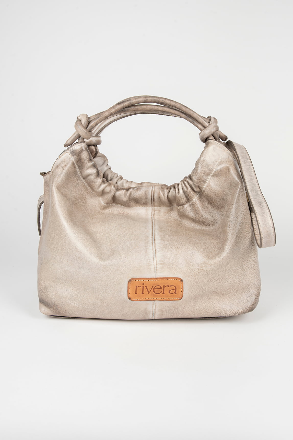 - Doble asa superior con detalle de nudos y correa larga regulable.