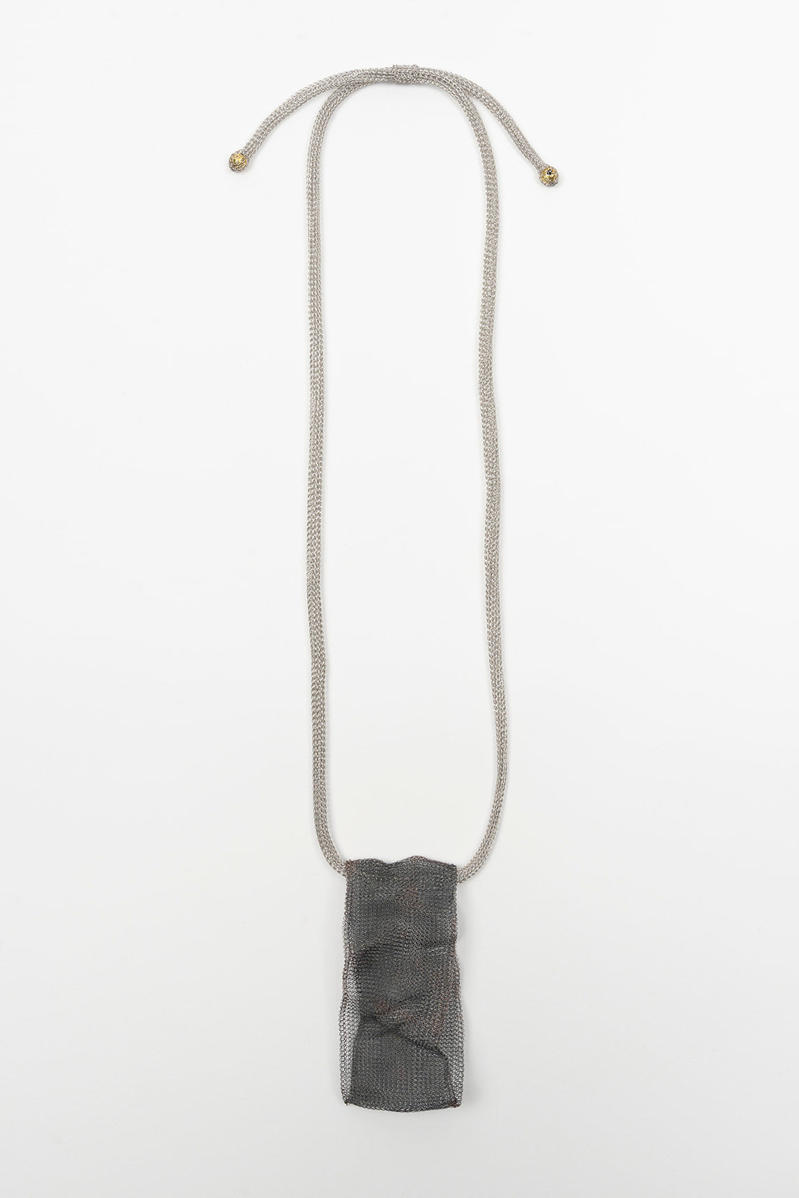 Colar comprido confecionado em malha metálica entrançada à mão, com uma composição em cinzento aço e preto fumado que lhe confere um aspeto sóbrio e elegante. O seu design minimalista, com um caimento fluido e uma textura aberta, torna-o uma peça moderna e intemporal.