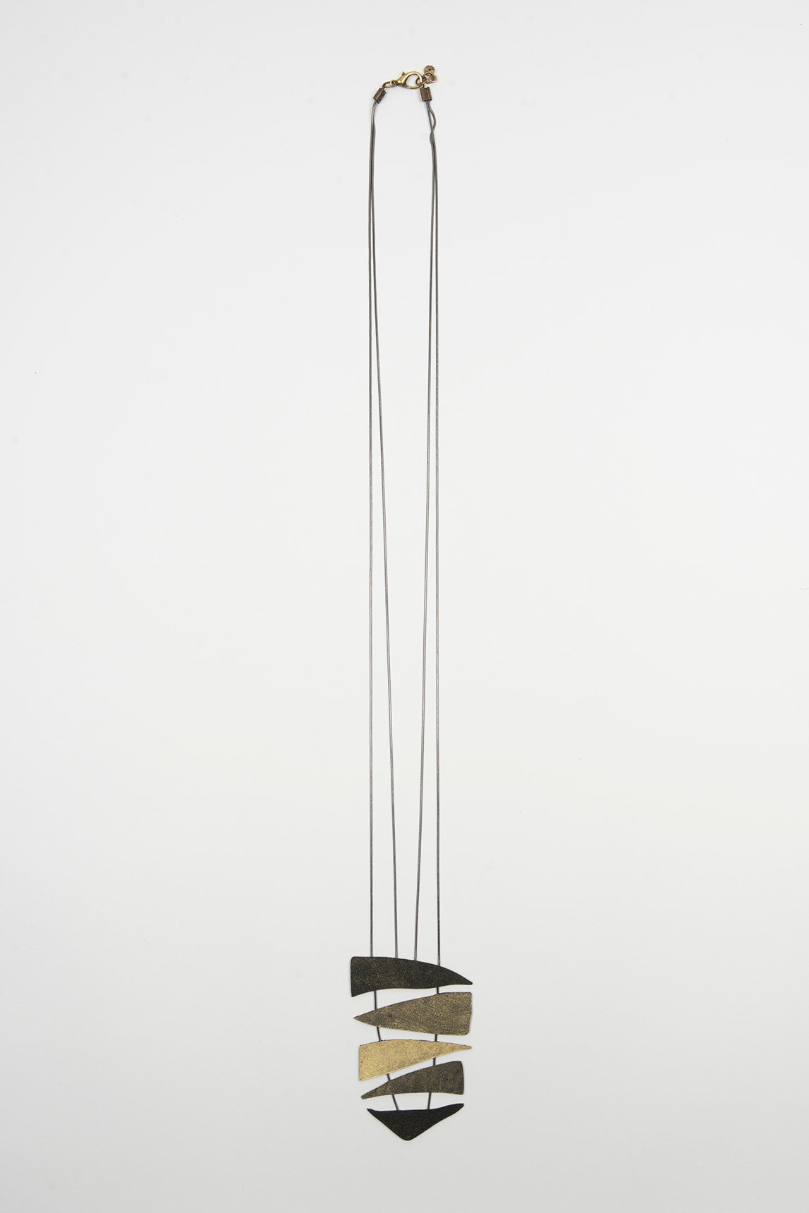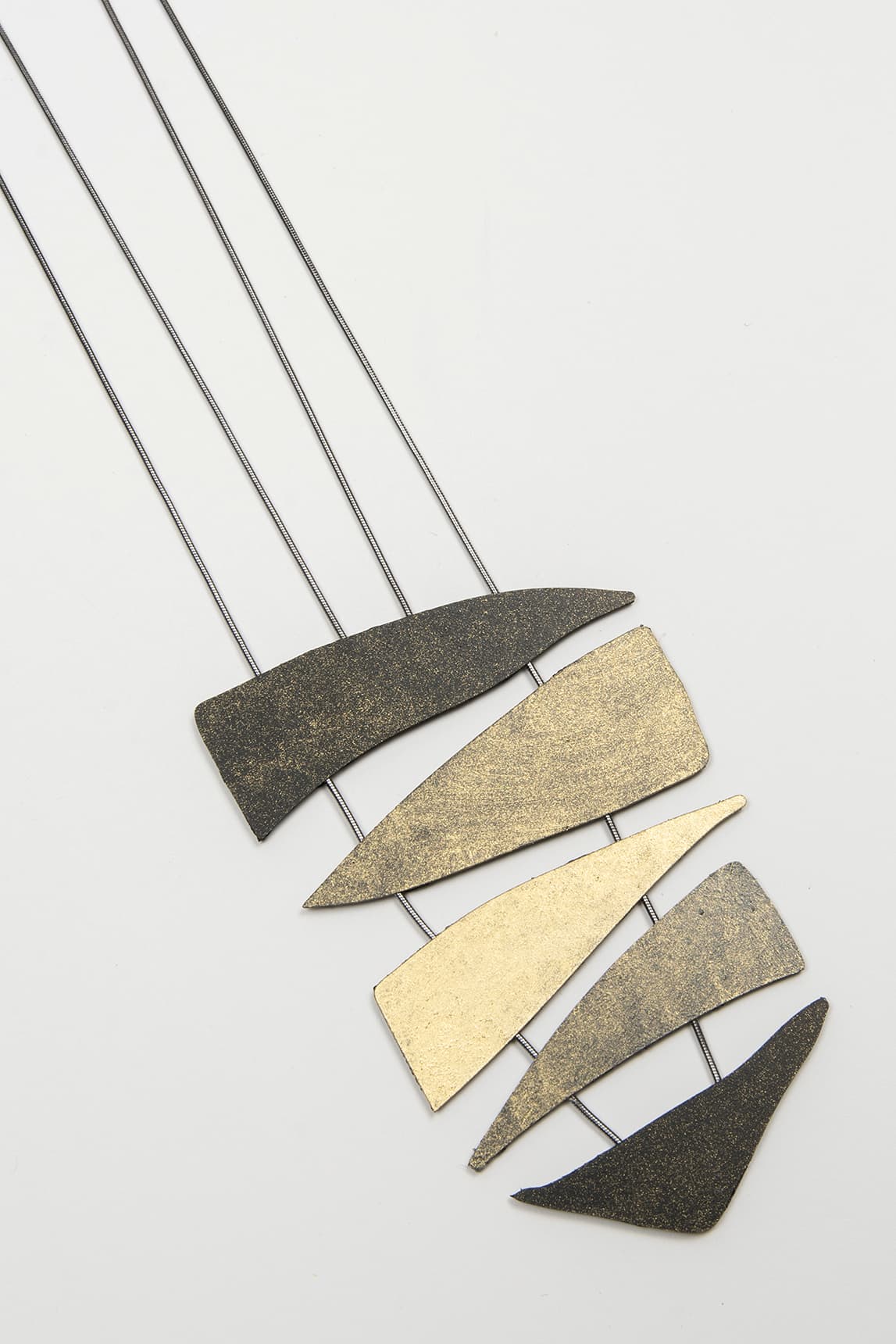 - Colgante geométrico con piezas superpuestas en plata y dorado.
