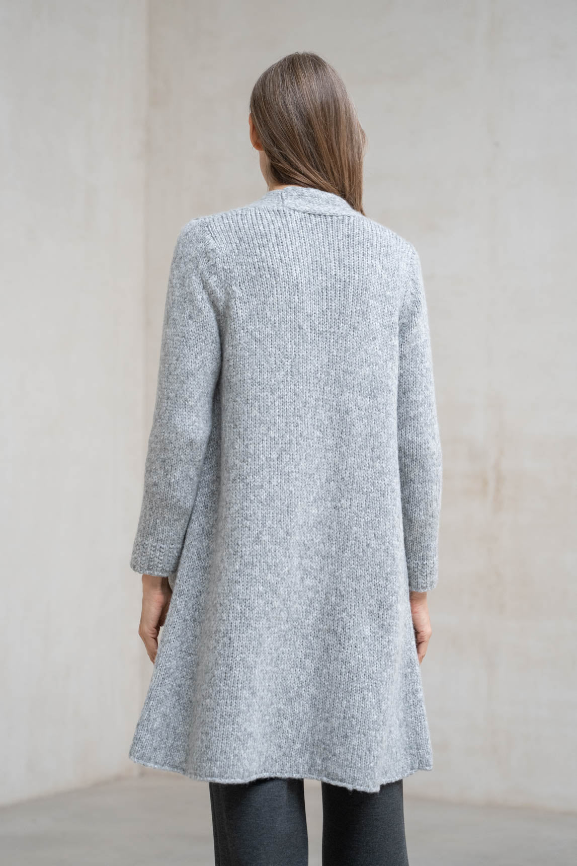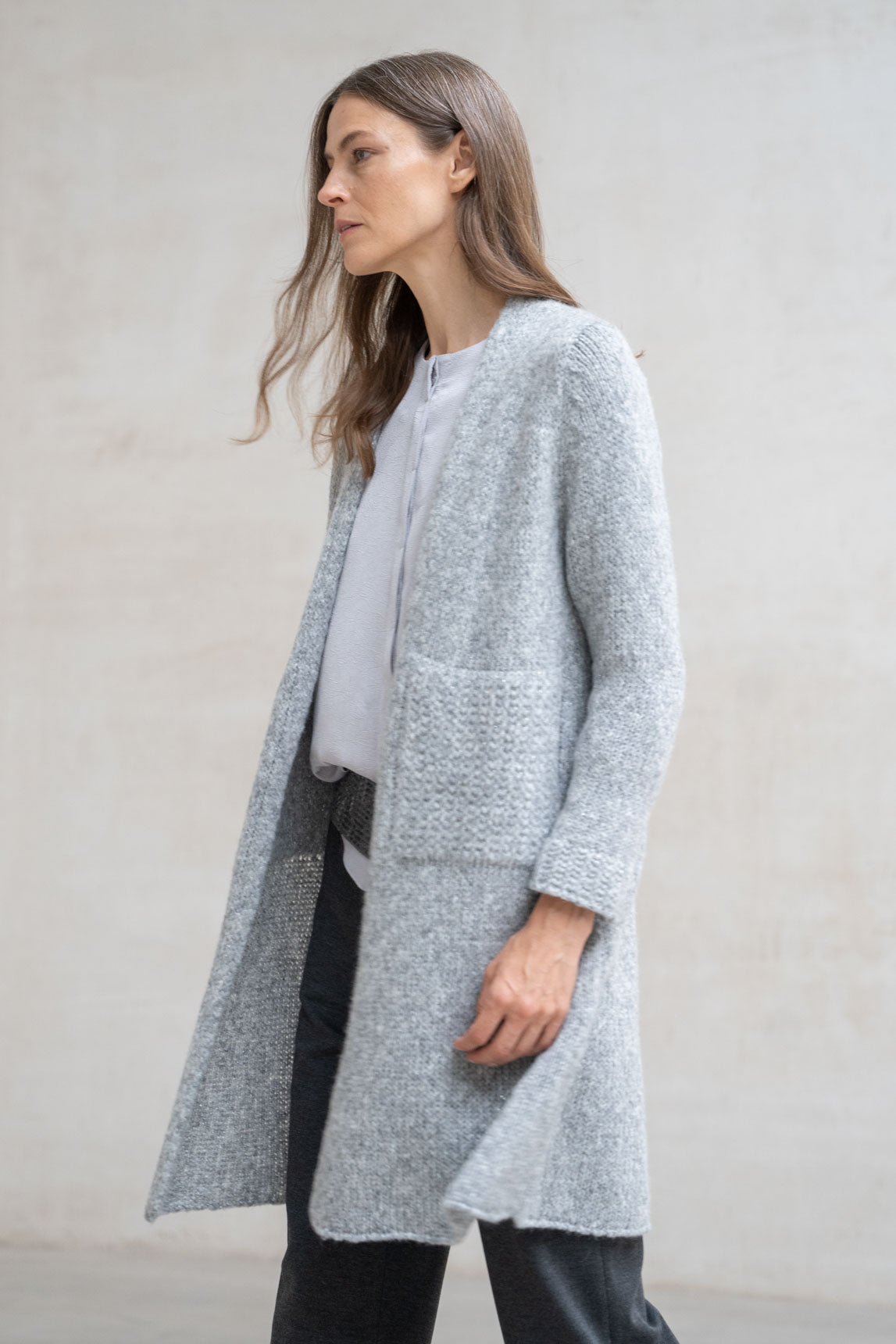 O cardigan Merano em lamê cinzento-pérola é perfeito para dar um toque de brilho subtil a qualquer look. O seu tecido delicado e design versátil fazem dele um item essencial para os dias frios e de transição.
