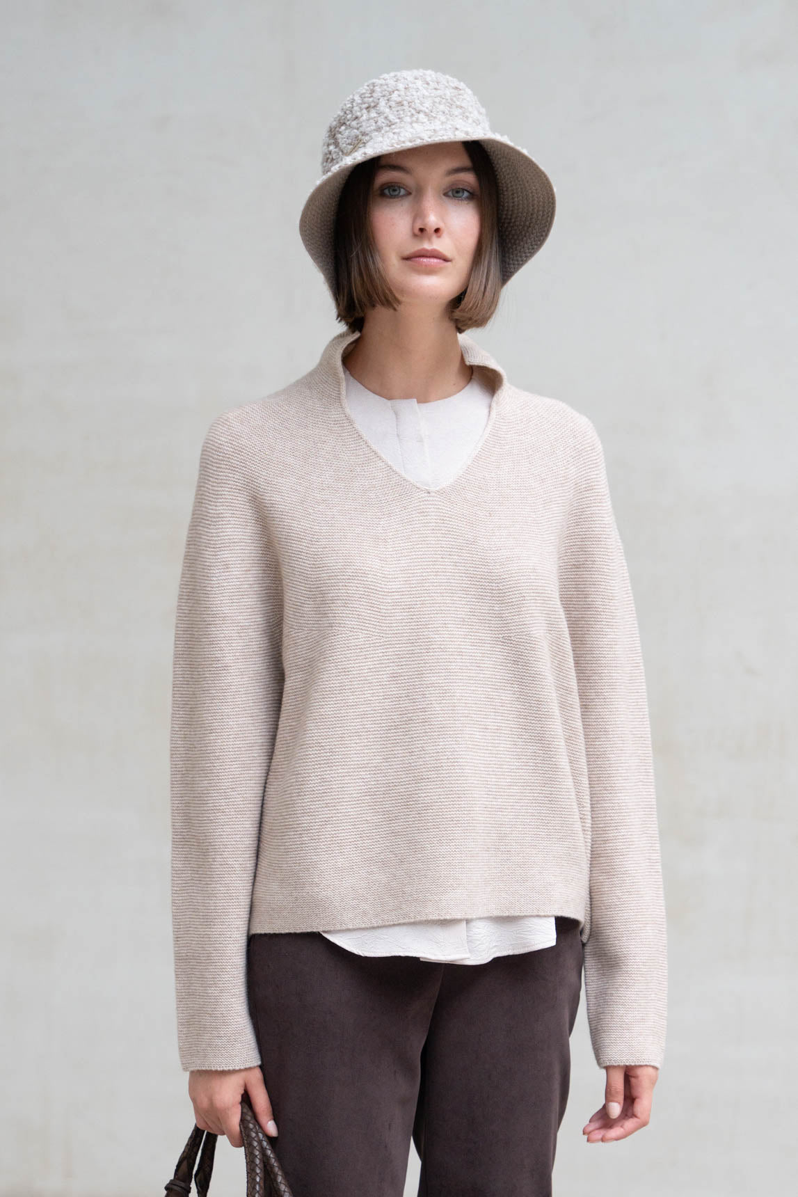 A camisola Trento bege é uma peça versátil e intemporal que combina conforto e estilo. A sua gola com lapela aberta e decote em V proporcionam um toque moderno e descontraído, enquanto a malha leve e fluida o torna uma peça essencial para o dia a dia. Ideal para combinar com calças plissadas, saias midi ou jeans, oferece looks minimalistas com um toque sofisticado.