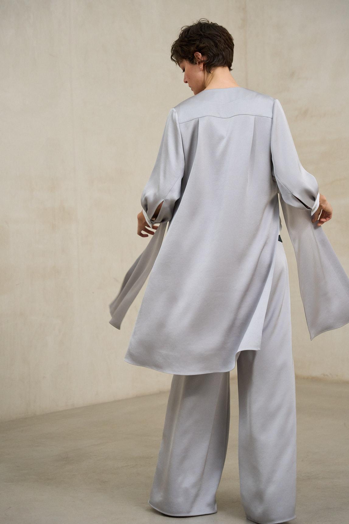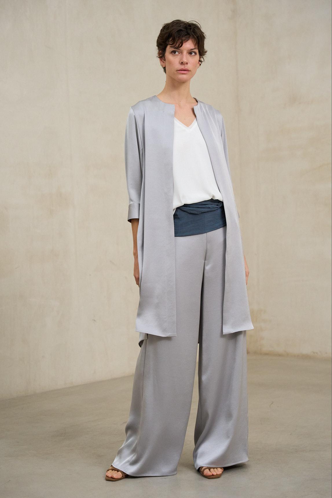 La levita Náyade gris azulado es una prenda exterior ligera y sofisticada que estiliza la silueta gracias a su diseño abierto y su caída vertical. Confeccionada en tejido fluido, presenta un largo por debajo de la cadera que aporta movimiento y elegancia sin añadir rigidez. Su estructura limpia, sin botones ni cierres visibles, mantiene el delantero depurado y favorece una línea alargada y armónica.