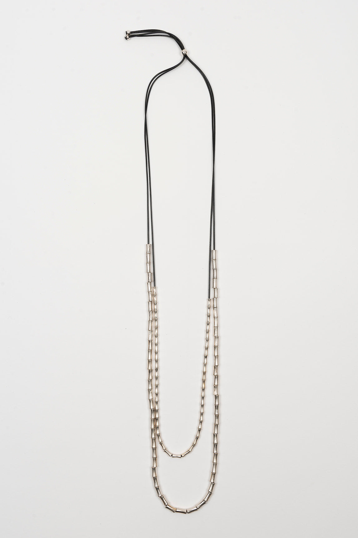 Este colar comprido de duas voltas destaca-se pela harmonia entre as suas linhas retas e os materiais contemporâneos. O fino fio preto contrasta com as delicadas contas cilíndricas de metal banhadas a prata, acrescentando brilho sem o sobrecarregar. Graças ao seu fecho ajustável com nó deslizante, pode ajustar o comprimento para combinar com o seu look: ideal tanto para peças básicas como para looks mais elaborados. Um design elegante e intemporal que se adapta facilmente a diferentes estilos e ocasiões.