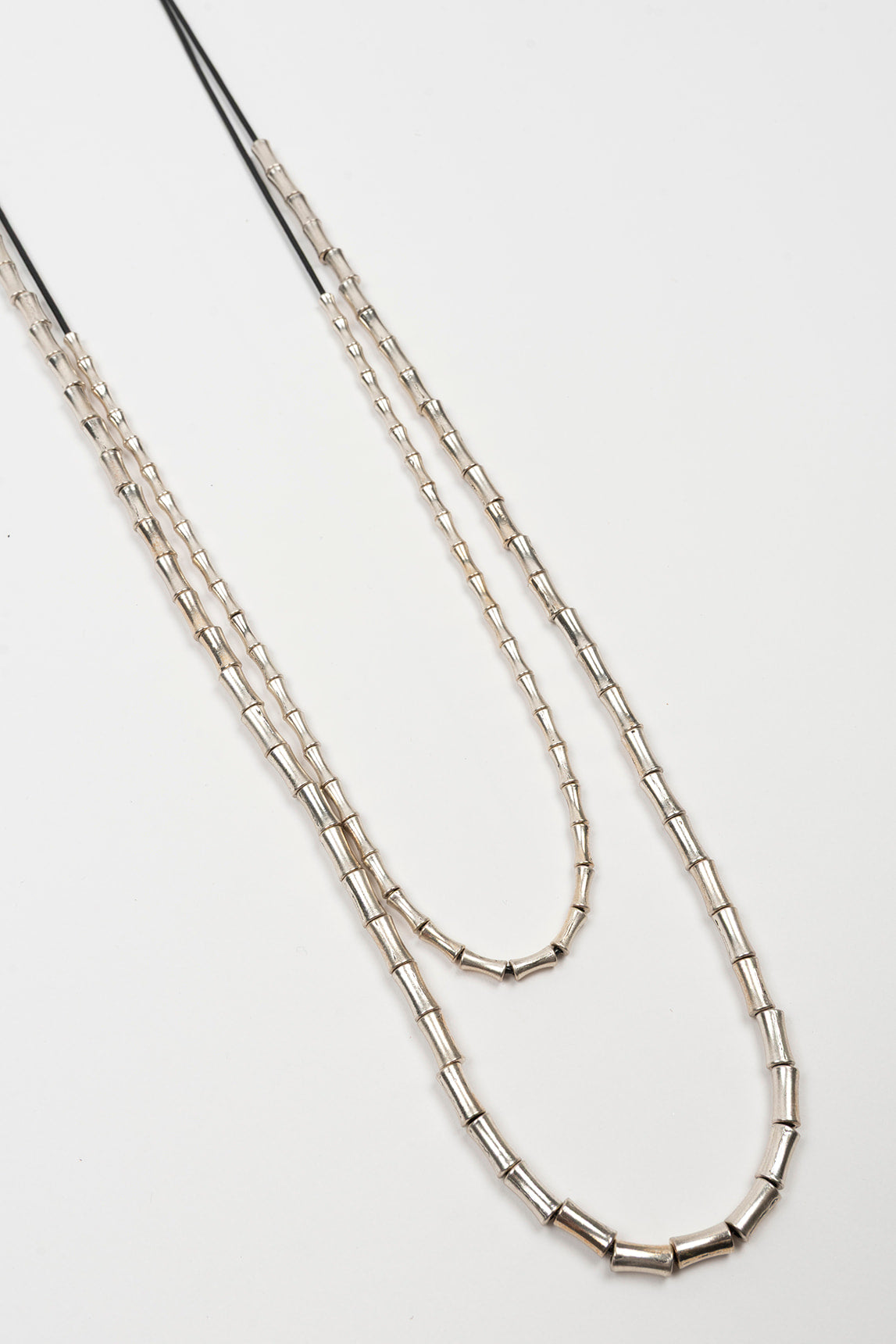 - Contas cilíndricas de metal banhadas a prata dispostas em duas filas.