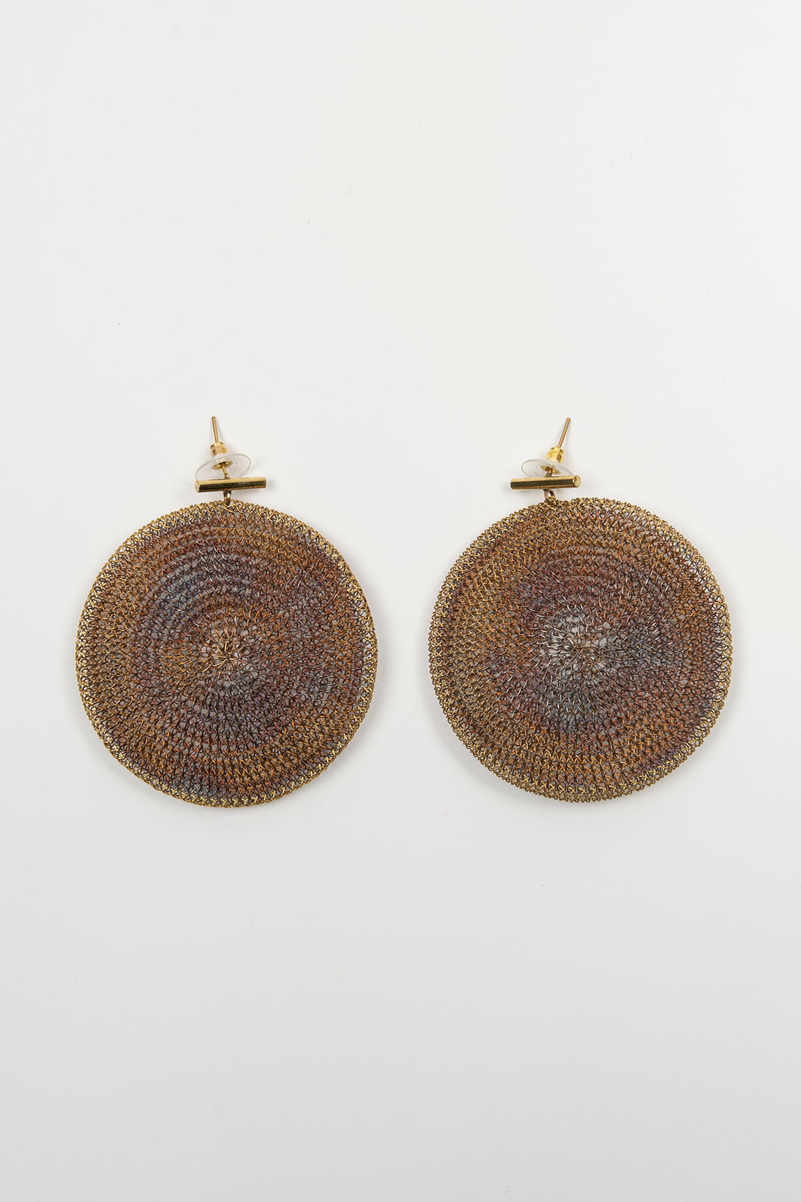 - Pendientes circulares elaborados artesanalmente en malla metálica con tonos bronce iridiscentes.