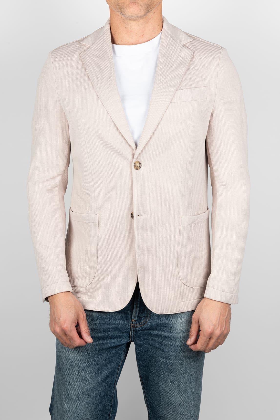 Its aesthetic combines informal elegance and versatility, making it an easy garment to integrate into modern masculine styles. Beige adds luminosity and a fresh air, ideal for combining with plain t-shirts, light shirts, denim, or trousers in stone and sand tones. The textured finish softens its formality and reinforces a natural, modern, and very wearable presence. Also available in navy blue.