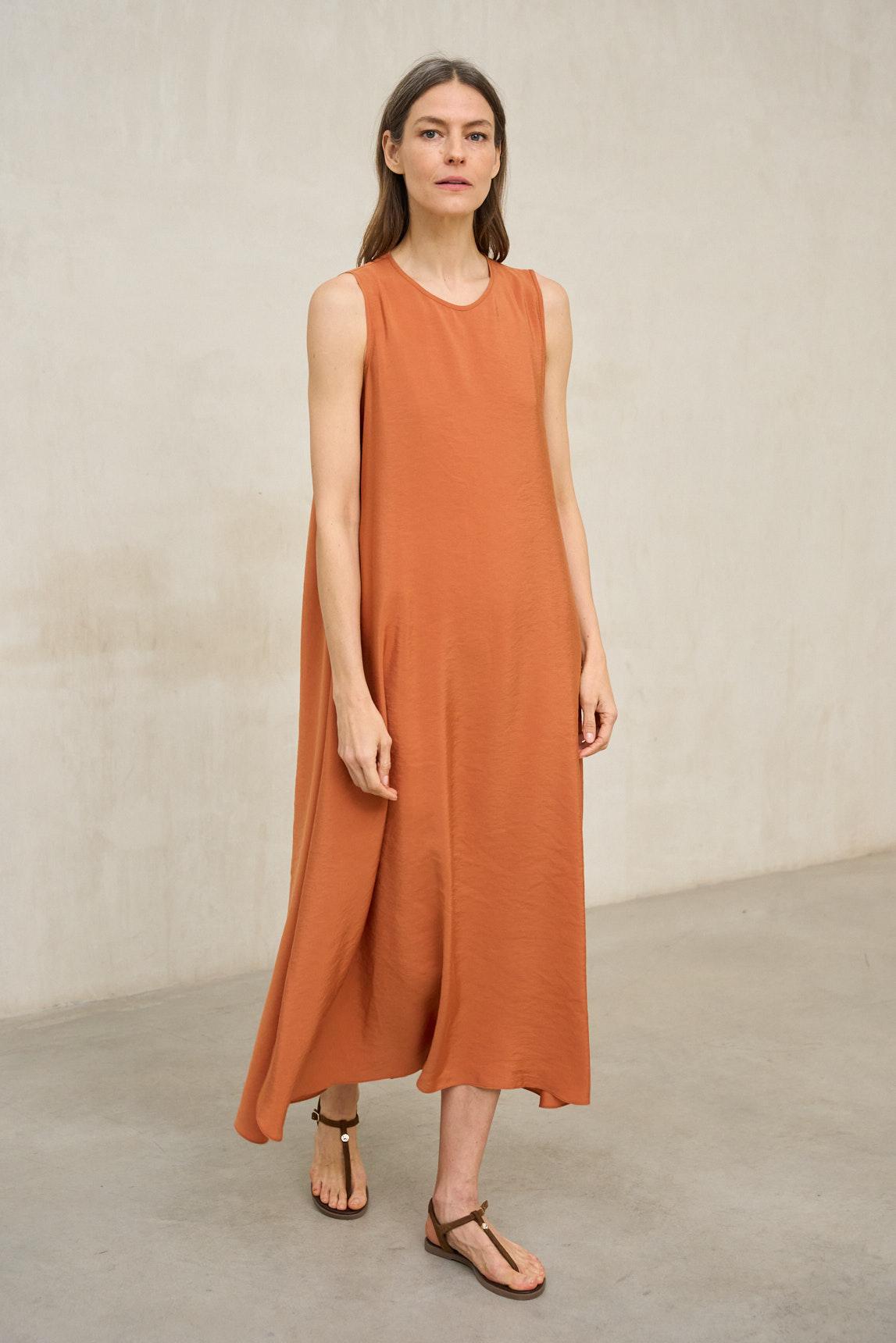 O vestido coral Elara é uma peça fluida com linhas simples que se destaca pela silhueta descontraída e pelo movimento natural. O seu design sem mangas e o decote redondo mantêm uma estética refinada e intemporal, enquanto o corte em A proporciona leveza e um ajuste fluido ao caminhar.