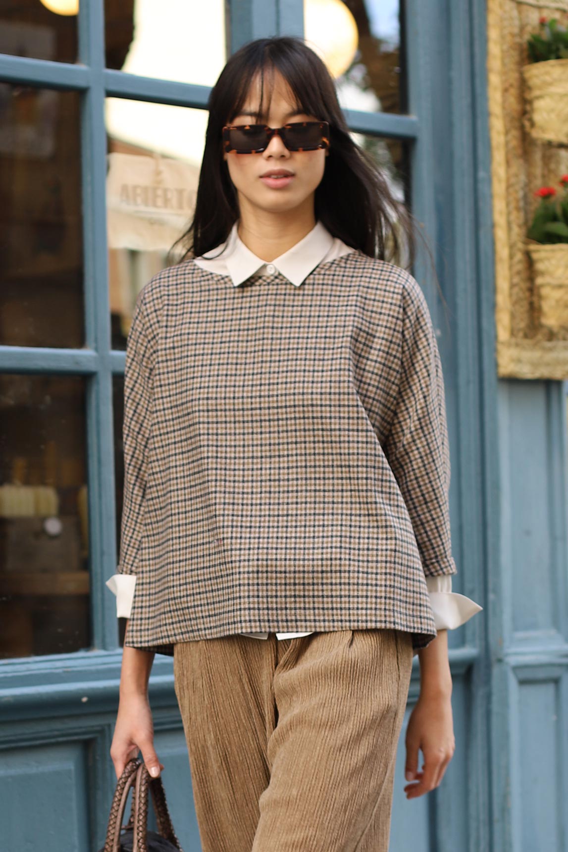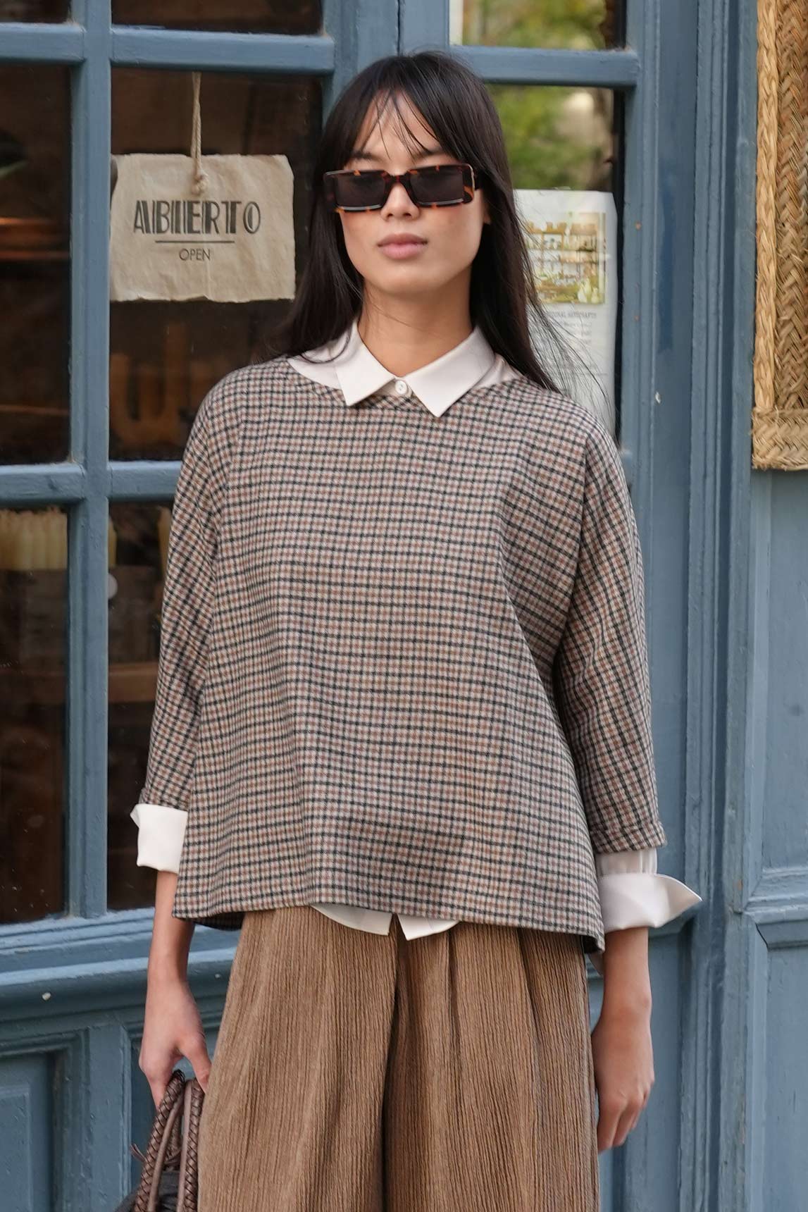 El top Verona en cuadros beige es una prenda versátil y muy favorecedora para el día a día. Su tejido con patrón de cuadros en tonos beige con matices tostados y crudo aporta luz y elegancia sin recargar. El corte recto cae con fluidez y permite superponerlo sobre camisas o camisetas finas; la manga 3/4 y el cuello caja equilibran el volumen para un fit cómodo y pulido. Combínalo con vaquero blanco, sastre en tonos tierra o falda midi para un look casual-chic perfecto para oficina y planes de fin de semana.