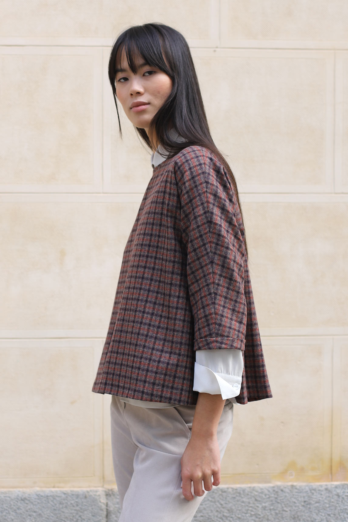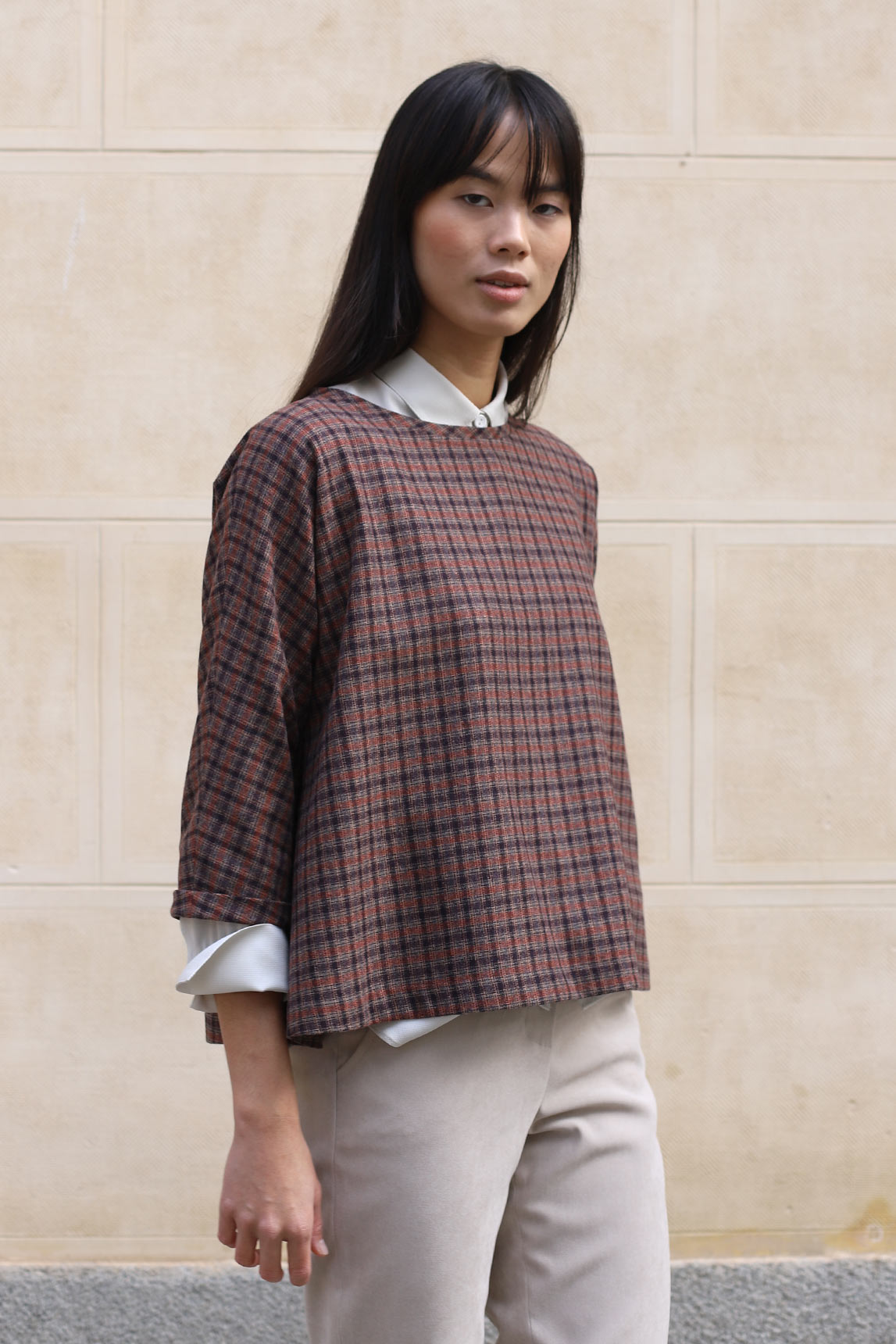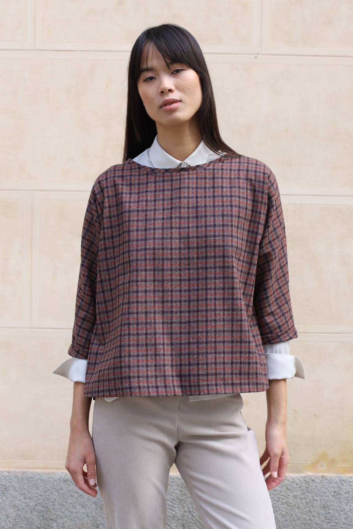 El top Verona es tu aliado fácil para looks de entretiempo. Su tejido con motivo de cuadros en burdeos y toques antracita y crudo aporta carácter sin recargar, mientras el corte recto cae con fluidez y favorece sobre camisas o camisetas finas. La manga 3/4 y el cuello caja equilibran el volumen para un fit cómodo y pulido. Combínalo con vaqueros, sastre o falda midi para un estilo casual-chic de diario u oficina.
