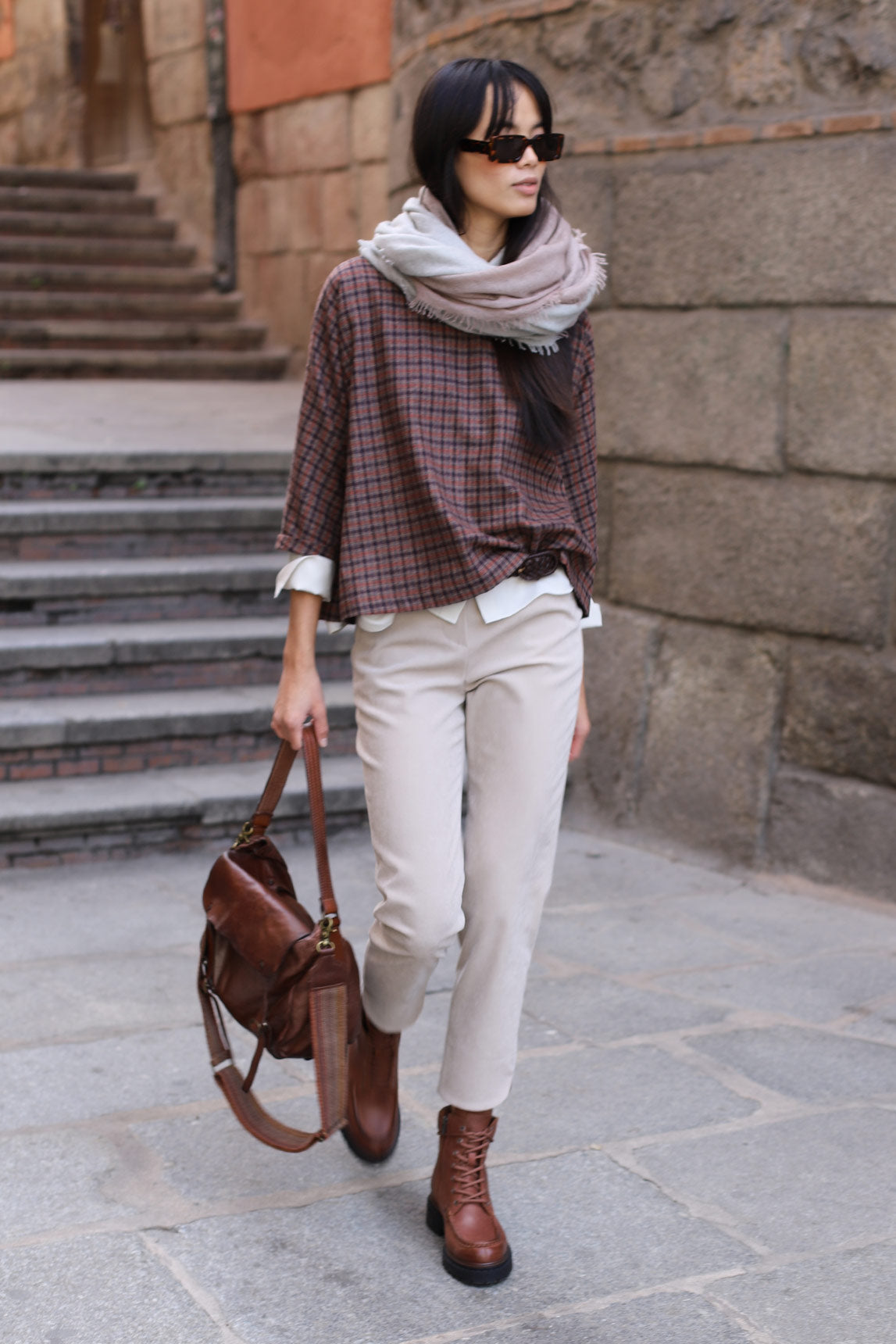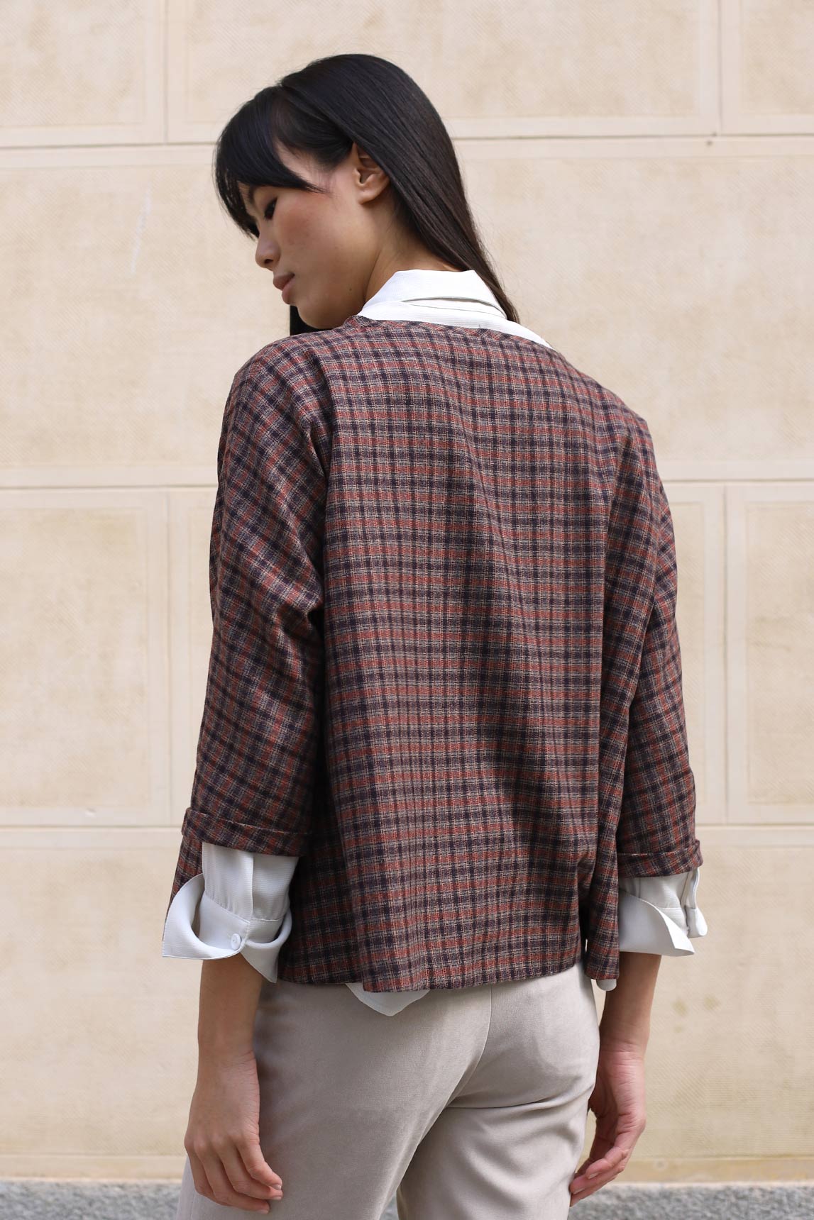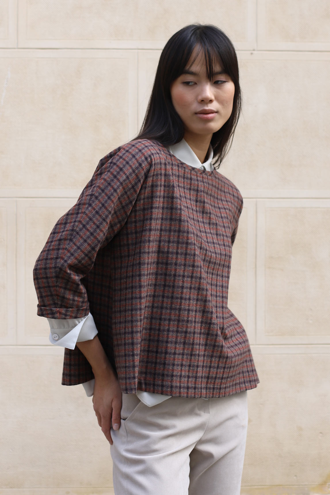 El top Verona es tu aliado fácil para looks de entretiempo. Su tejido con motivo de cuadros en burdeos y toques antracita y crudo aporta carácter sin recargar, mientras el corte recto cae con fluidez y favorece sobre camisas o camisetas finas. La manga 3/4 y el cuello caja equilibran el volumen para un fit cómodo y pulido. Combínalo con vaqueros, sastre o falda midi para un estilo casual-chic de diario u oficina.