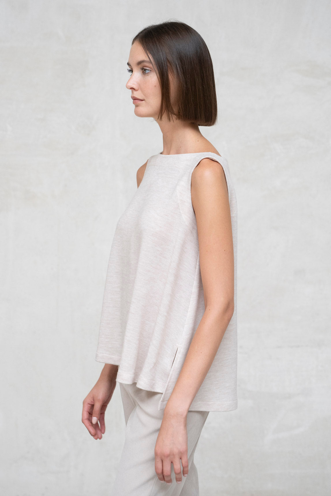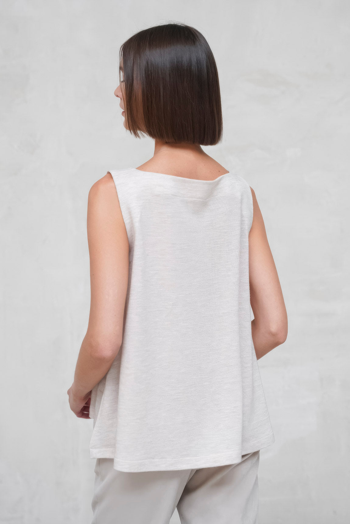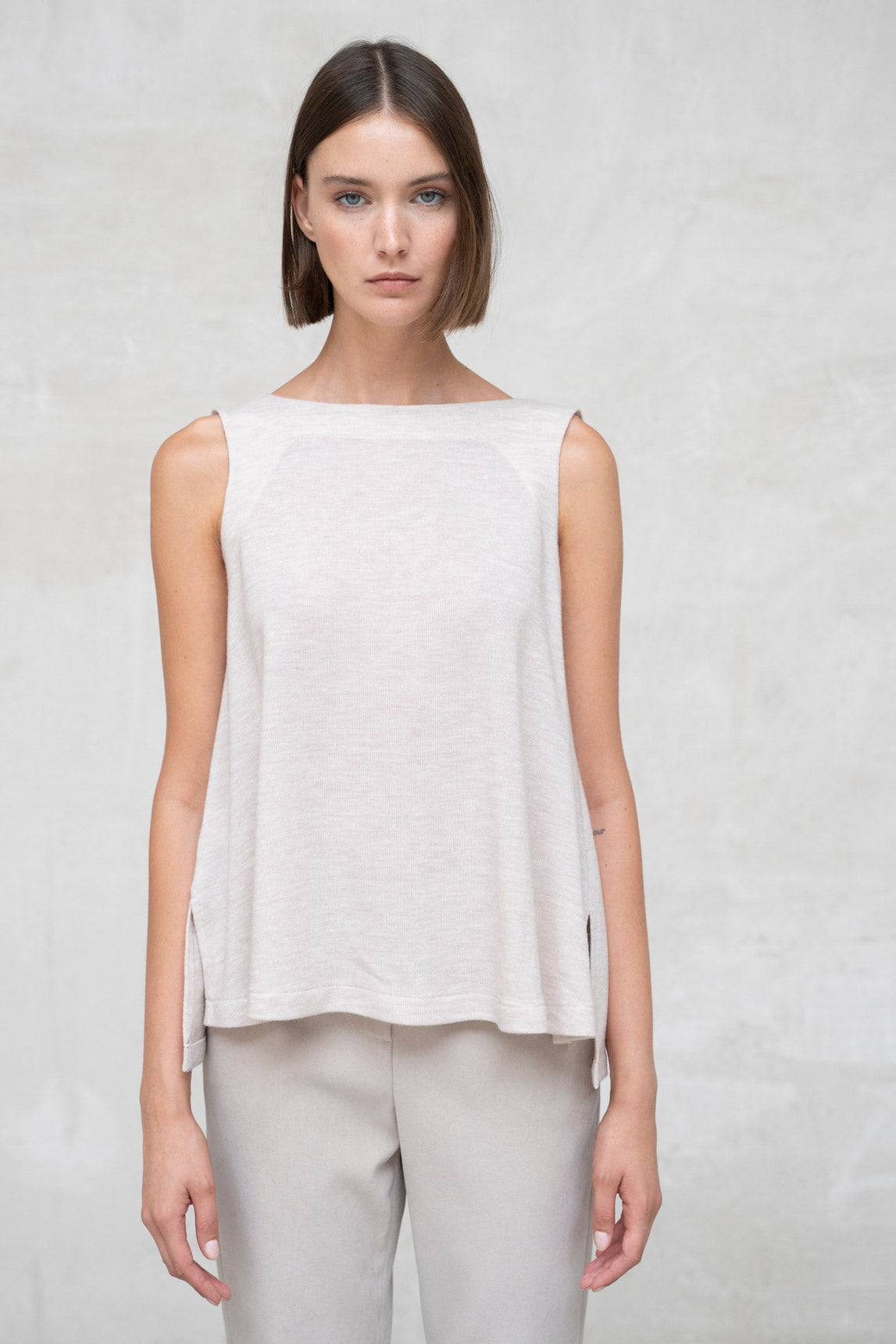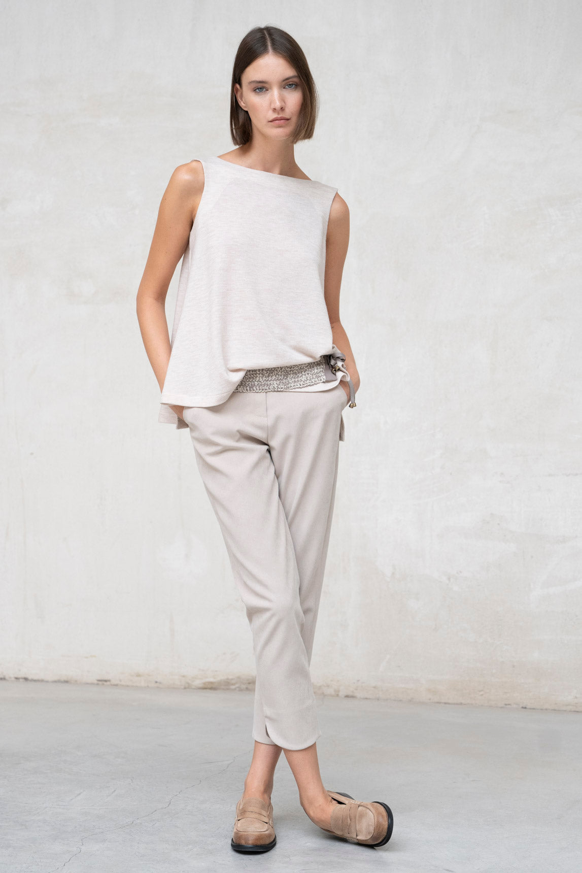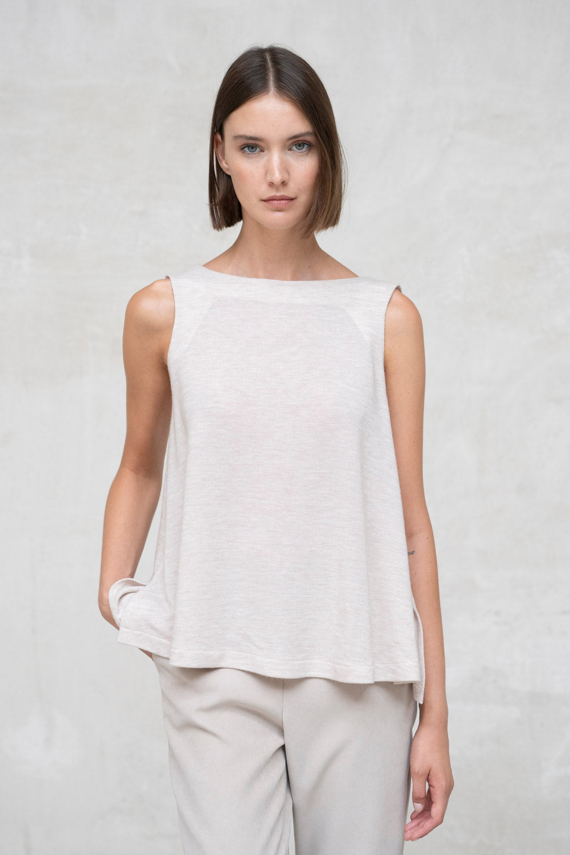 O top Vicenza off-white é uma peça versátil que pode ser usada tanto com looks casuais como com conjuntos mais elegantes. A sua simplicidade e caimento fluido fazem dele uma peça essencial intemporal, perfeita para usar em camadas ou sozinha, acrescentando frescura e estilo ao seu guarda-roupa.