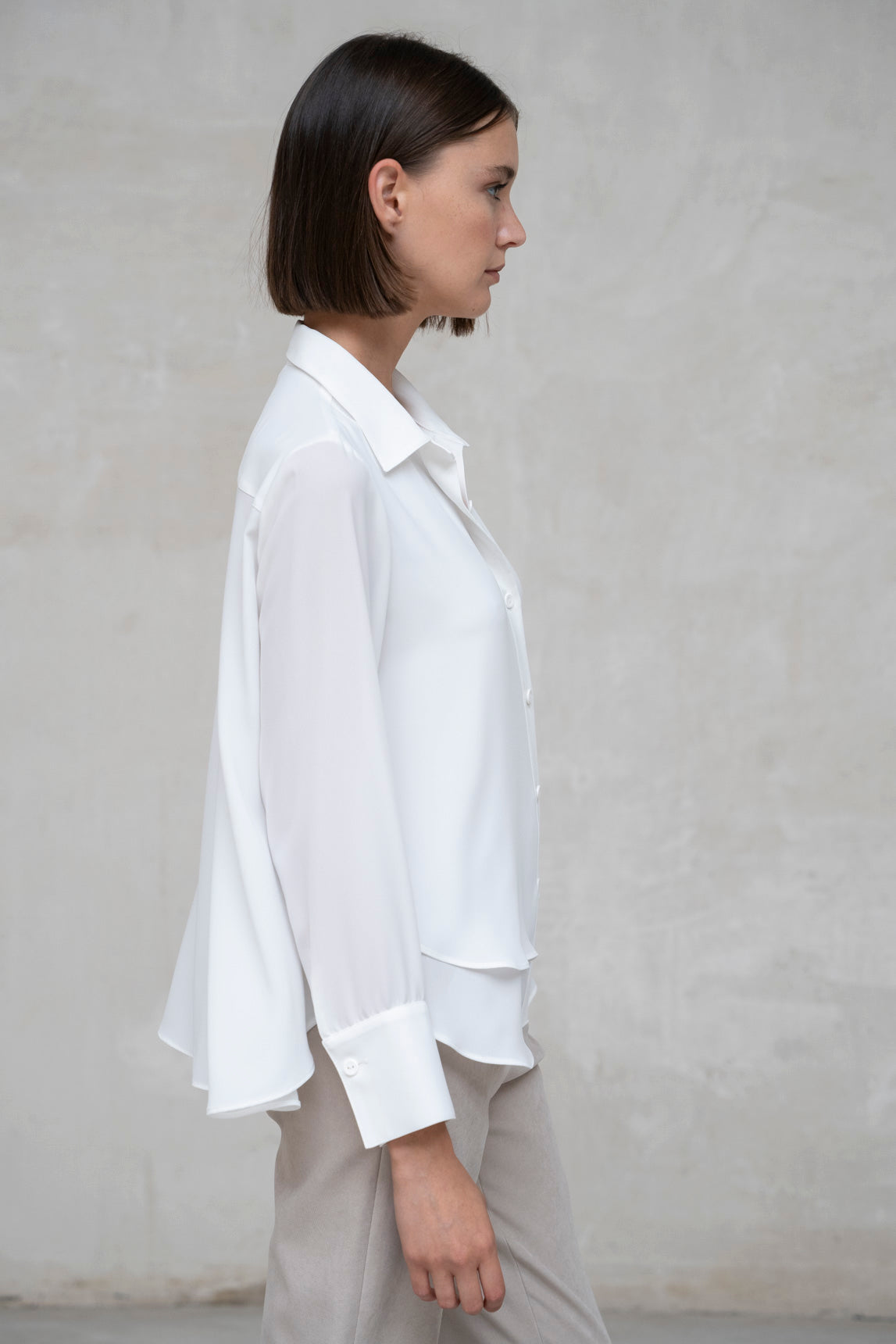 - Tecido fluido de toque suave na cor branca.