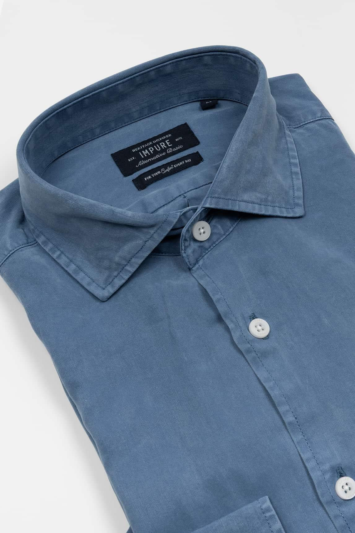 Camisa de manga larga en azul medio con diseño liso y una silueta depurada de líneas suaves. El modelo presenta cuello clásico, cierre frontal de botones visibles y puño sencillo, con una superficie de aspecto natural y una textura visual sutil que añade profundidad al color. La estructura se percibe ligera y flexible, favoreciendo una caída cómoda y un resultado visual limpio, sereno y muy combinable.
