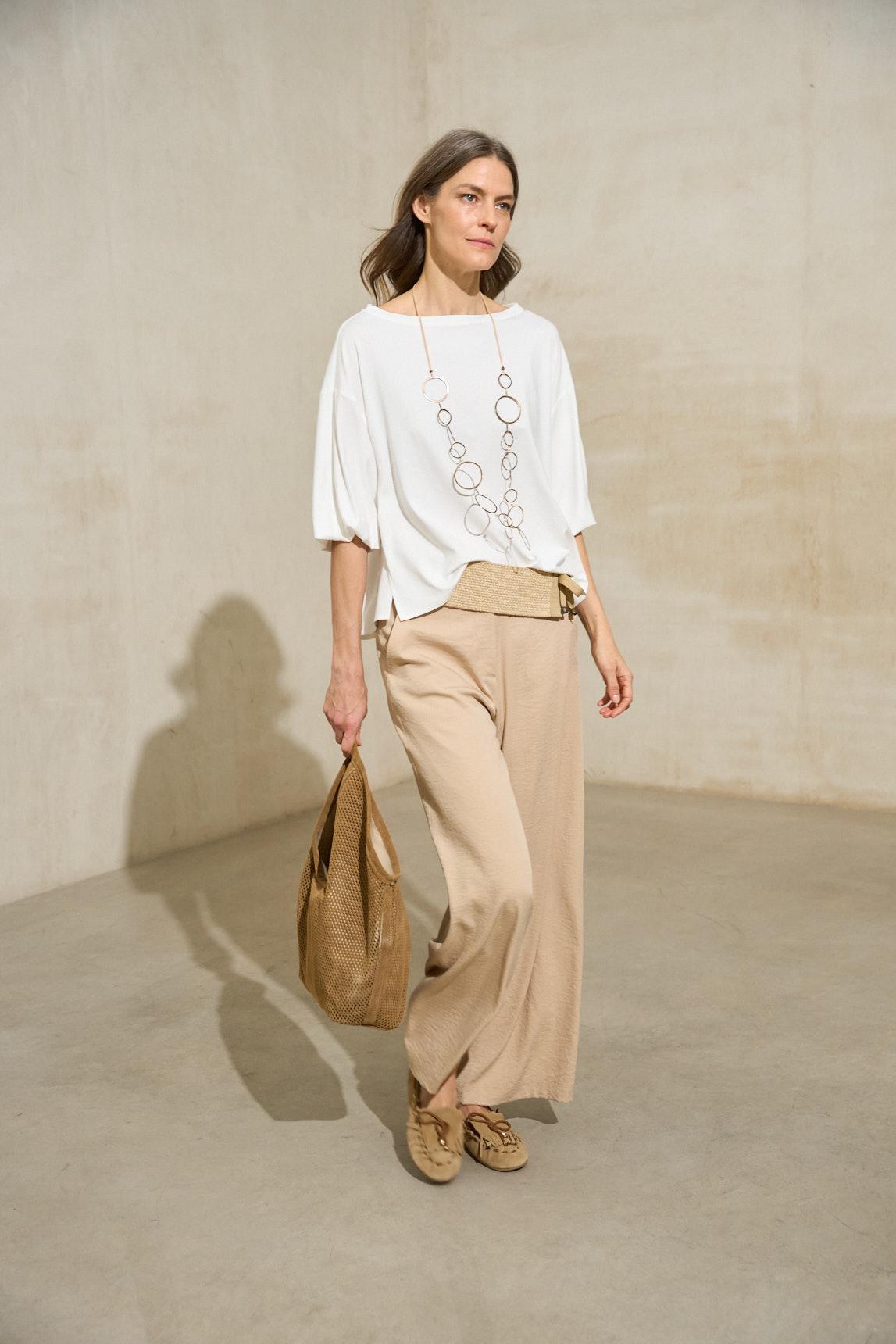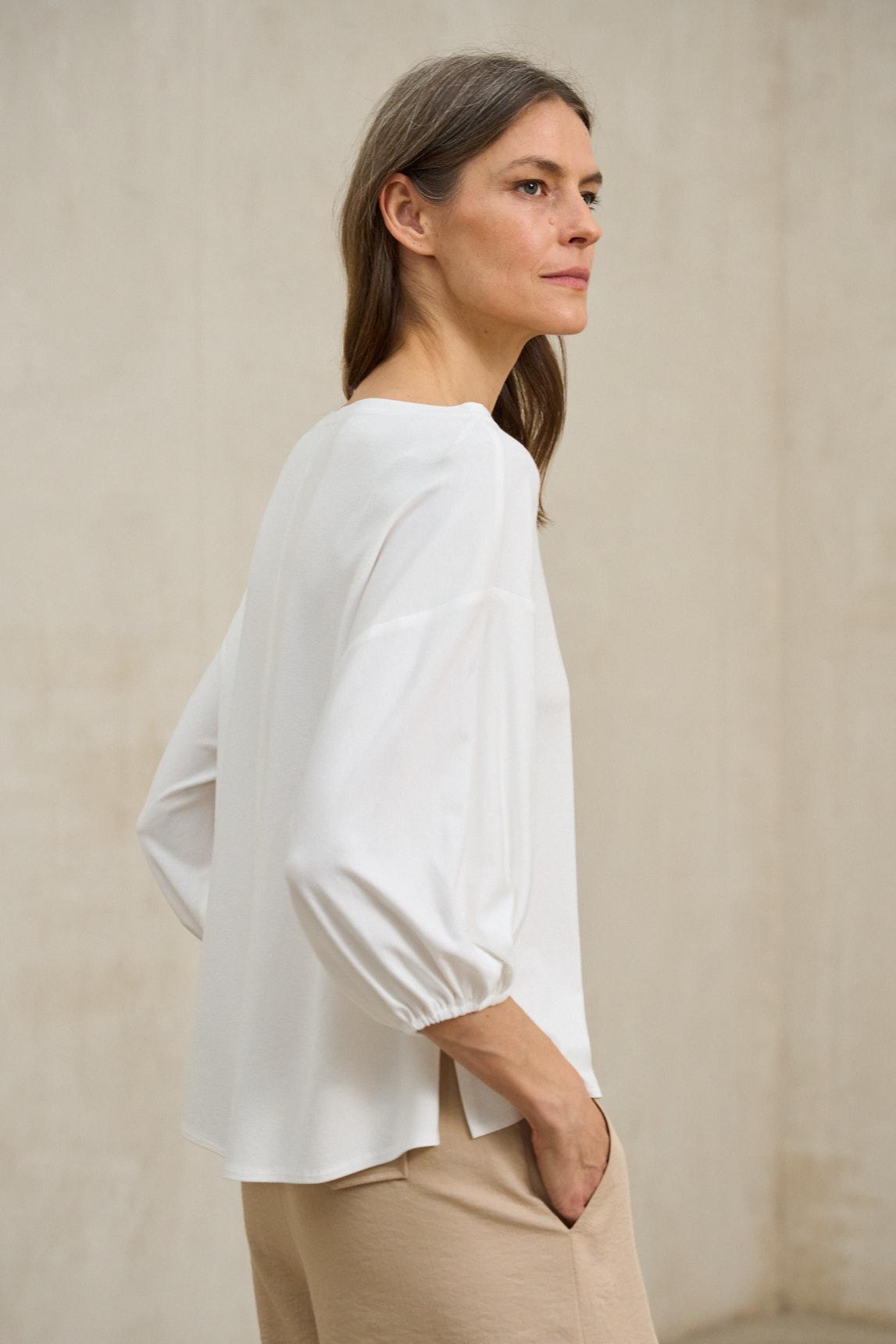 Camiseta de mujer confeccionada en tejido de punto ligero con tacto suave y caída natural. Escote barco, manga larga con frunce elástico en el puño y silueta fluida que aporta un aire desenfadado y femenino.