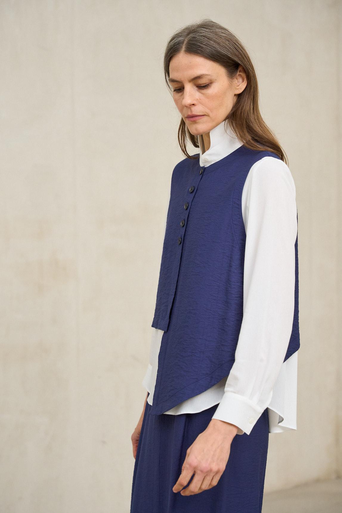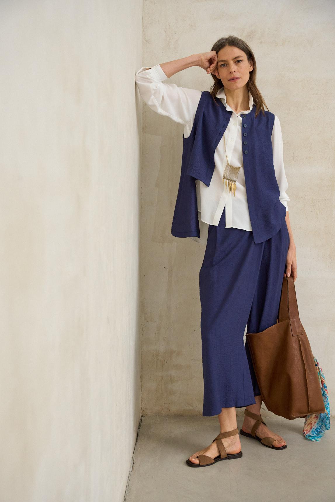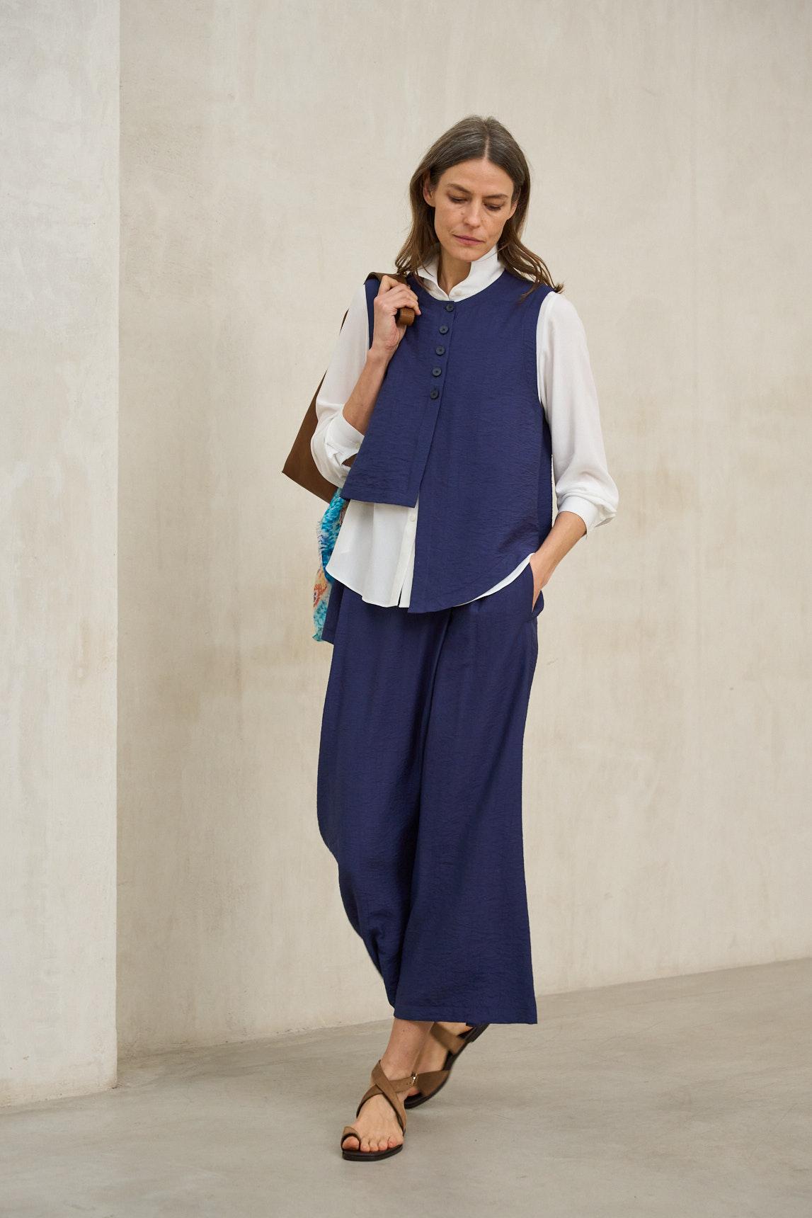 Este chaleco sin mangas presenta un escote redondeado y un cierre frontal con botones vistos que recorre el centro con un acabado delicado. El tejido se aprecia con textura suave y ligeramente arrugada, y la silueta cae amplia con un bajo asimétrico que se prolonga en el lateral, aportando movimiento y un punto distintivo. La línea general es ligera y fluida, con un aire relajado pero cuidado. En azul marino se siente especialmente elegante y fácil de combinar: queda perfecta con pantalón blanco o beige para contraste, con denim oscuro para un look tonal, o con una falda midi para un conjunto más pulido. Los botones aportan detalle sin recargar, y el corte permite llevarla suelta o con un semimetido para definir la cintura. Disponible también en beige arena. Ideal para días de entretiempo y planes que piden comodidad con presencia, es una prenda que eleva lo básico con sutileza. Su asimetría y textura aportan personalidad, y el color profundo suma serenidad y estilo en cualquier ocasión. Nos esforzamos por mostrar los colores de la forma más fiel posible, pero pueden variar ligeramente respecto a la realidad.