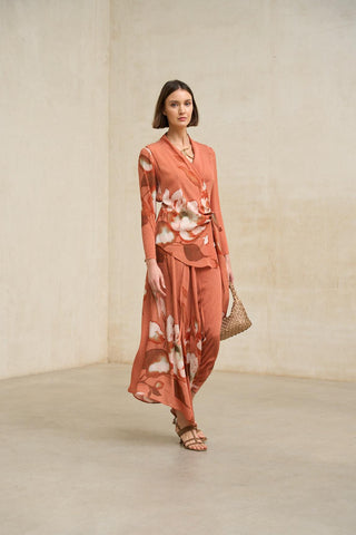 Falda midi confeccionada en tejido ligero con movimiento fluido y caída natural. Presenta diseño asimétrico con picos irregulares que aportan dinamismo y un aire desenfadado al conjunto. El estampado floral en tonos terracota, coral y matices cálidos realza su carácter femenino y estacional.
