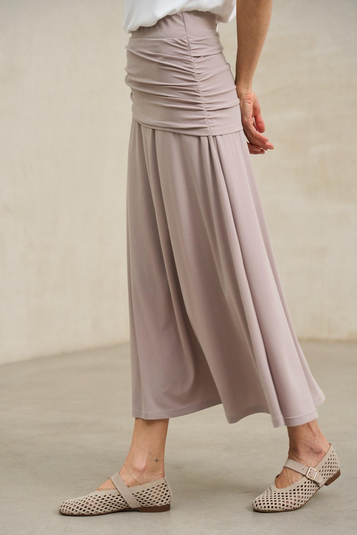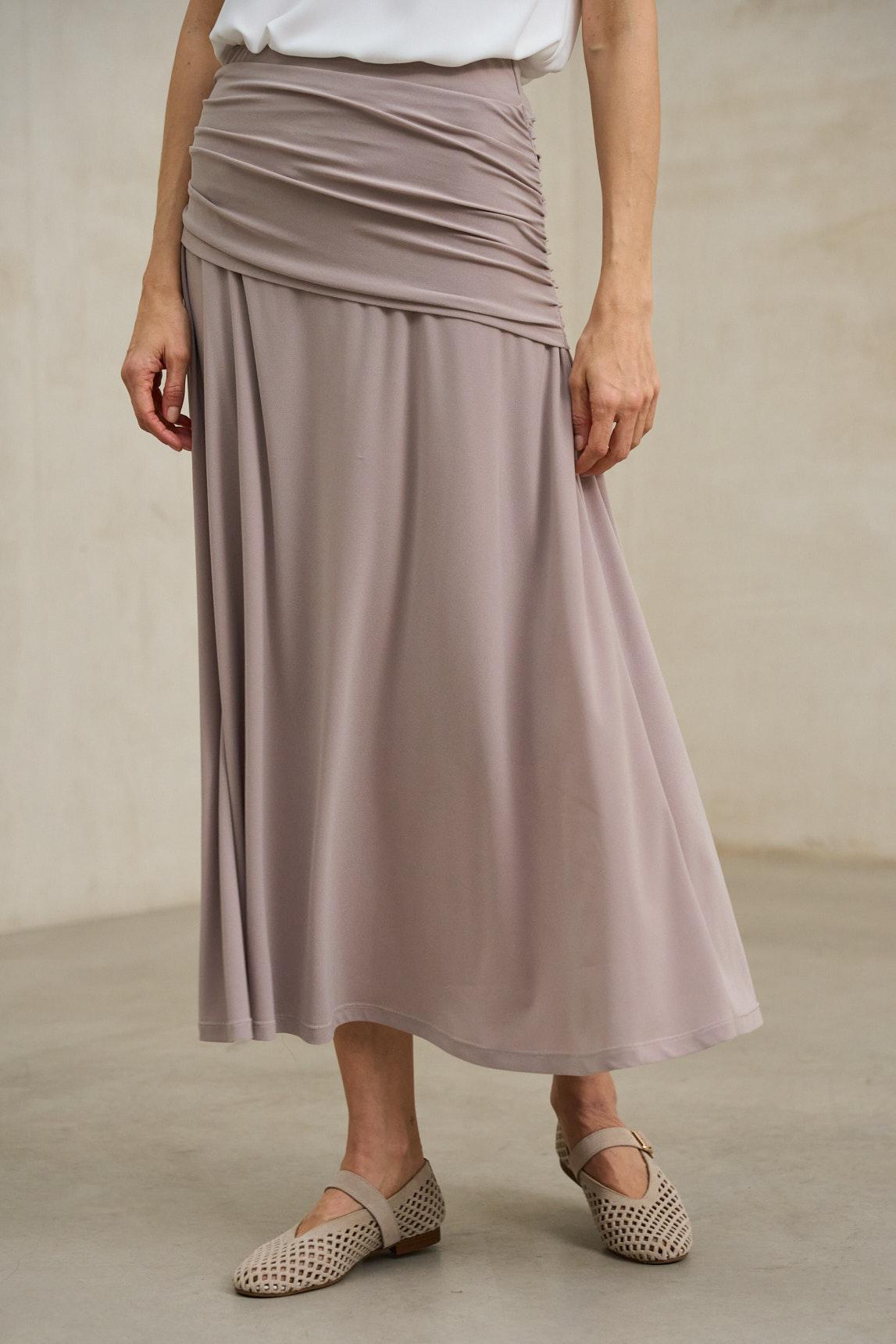Falda de mujer confeccionada en tejido de punto fluido con un elegante efecto drapeado en la parte superior. Su cintura alta con banda ancha envuelve la silueta aportando comodidad y un ajuste favorecedor. El diseño largo y la caída suave del tejido crean un movimiento natural que realza su carácter sofisticado. La Falda Kaia topo es una prenda versátil y atemporal. Su tono neutro y su acabado fluido permiten combinarla con camisas, tops o chaquetas ligeras, adaptándose con facilidad tanto a looks de día como a estilismos más refinados de noche. Nos esforzamos por mostrar los colores de la forma más fiel posible, pero pueden variar ligeramente respecto a la realidad.