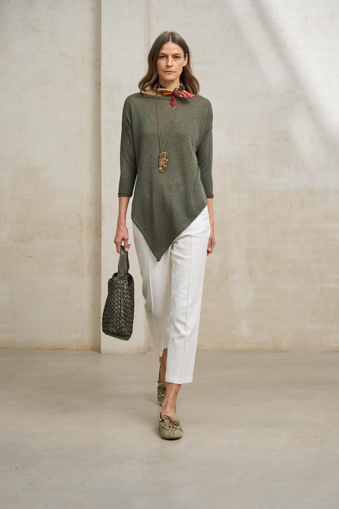 El tono verde musgo aporta profundidad y carácter natural, combinando especialmente bien con blancos rotos, crudos, beige o tonos tierra. Una pieza versátil y atemporal que encaja tanto en estilismos relajados de diario como en conjuntos más cuidados con pantalones fluidos o faldas midi.