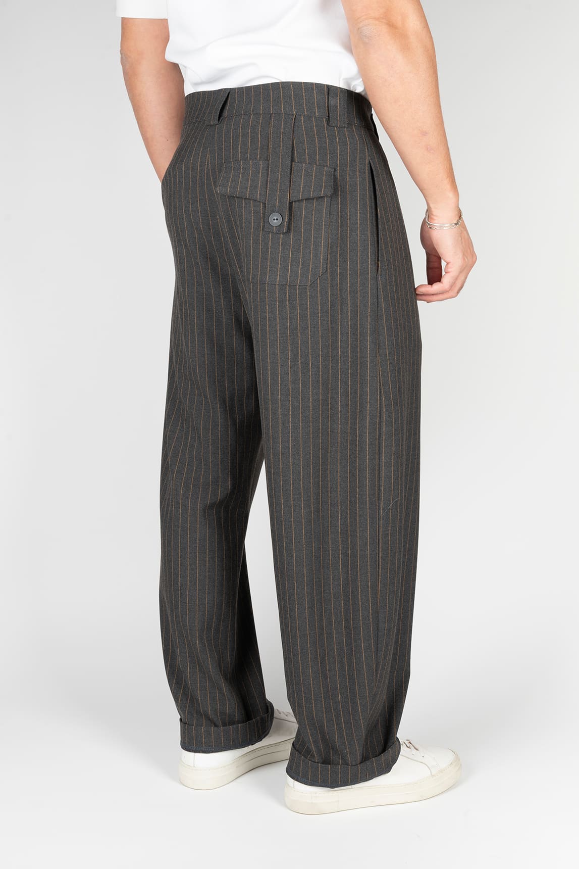 Este pantalón de lana con raya diplomática combina una estética sartorial clásica con un aire contemporáneo. Su silueta recta y el detalle del bajo vuelto aportan carácter y versatilidad, funcionando tanto en looks formales con americana como en combinaciones más relajadas con punto o camisa casual. Una prenda atemporal pensada para el día a día con un toque distintivo.